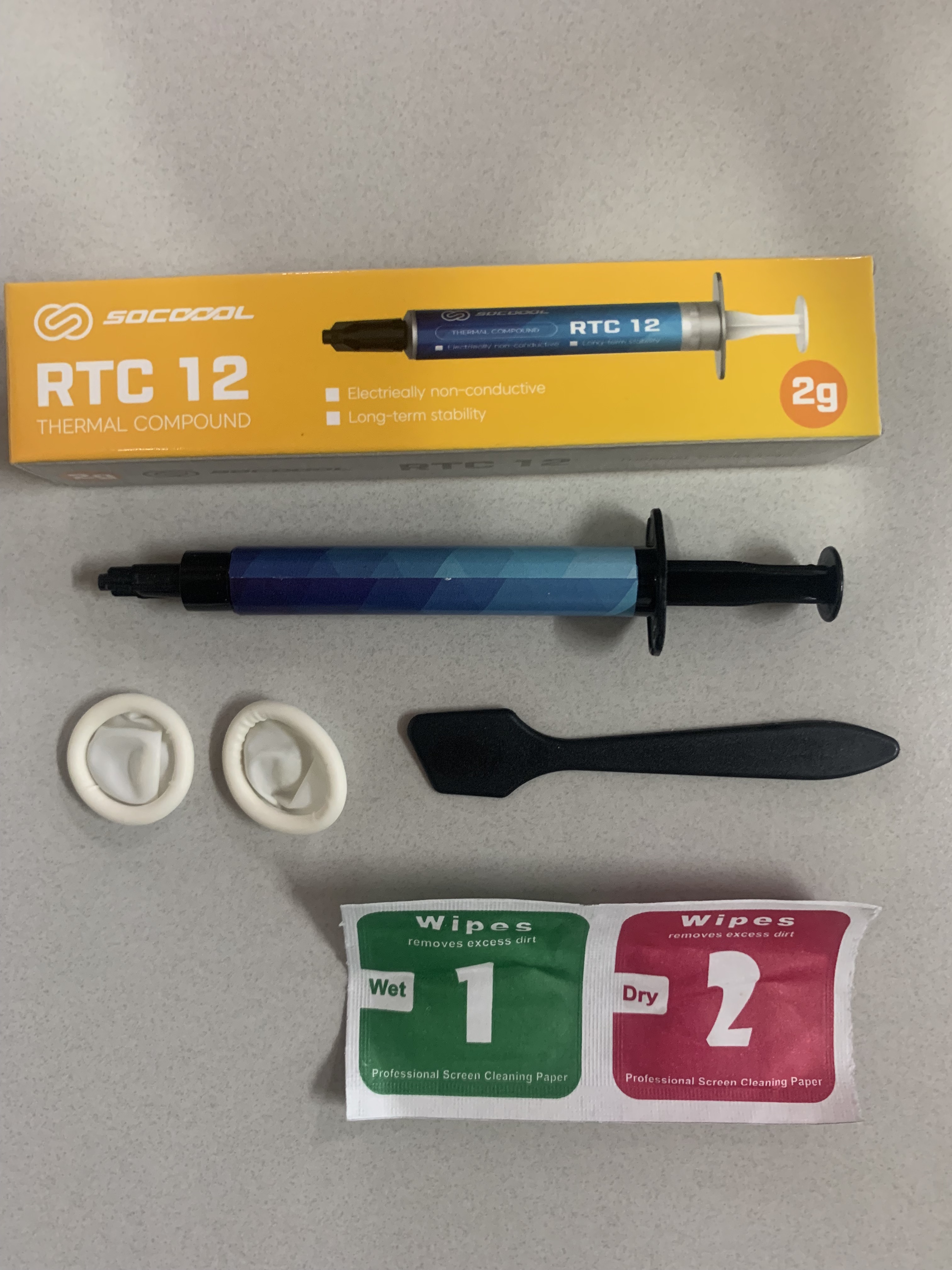 가장 일반적으로 많이 사용되는 타입인 주사기 형식의 본품과 도포하기전에 깨끗이 닦을수 있는 클리너와 써멀 페이스트를 펴 바를수 있는 주걱으로 구성되어 있입니다. 또한 도포용 골무 2개가 포함된것이 큰 특징입니다. 써멀 구리스는 펴바라는 분들에게는 손에 묻는거 방지용으로 유용할거 같습니다.