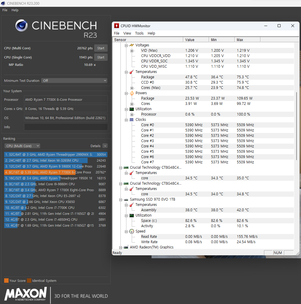 CPU를 최대한 많이 갈구는 CINEBENCH R23 멀티에서 최고온도 75.9도,