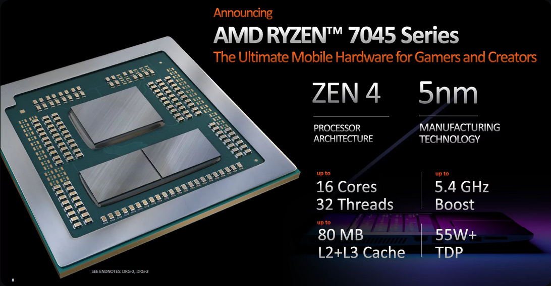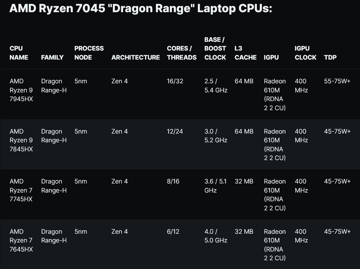 AMD Ryzen 7 7745HX는 이번 달 말에 출시될 4개의 Dragon Range 노트북 CPU 중 하나입니다. CPU는 8코어 16스레드, 40MB 캐시를 갖추고 있으며 클럭 속도는 베이스 3.6GHz 및 부스트 5.1GHz입니다. CPU는 45W의 TDP를 제공하며 이 하이엔드 및 매니아 등급 노트북 칩에서 오버클럭이 지원되므로 75W 이상으로 구성할 수 있습니다.