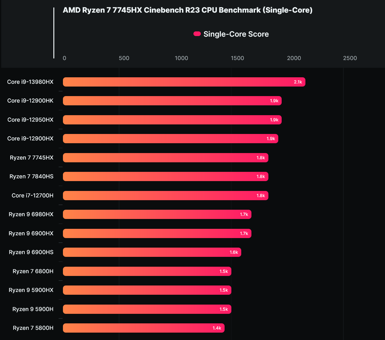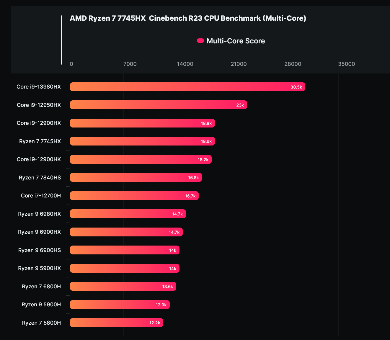 AMD Ryzen 7 7745HX의 벤치마크는 Cinebench R23에서 실행되는 칩을 보여주는 Bilibili 콘텐츠 크리에이터인 Golden Pig Upgrade가 게시했습니다. CPU는 베이스 클럭으로 확인되는 소매 모델입니다. 유출자는 칩이 95W에서 작동했기 때문에 오버클럭되었거나 이 칩이 제공하는 극한의 전력 제한일 수 있다고 언급했습니다.