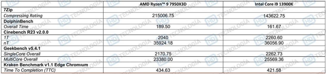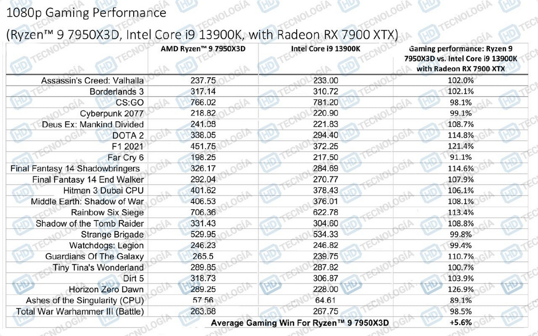 HDTecnologia는 플래그십 Ryzen 9 7950X3D 모델에 대한 리뷰 가이드에서 성능 수치를 유출했습니다. AMD는 내부적으로 Radeon RX 7900 XTX 또는 NVIDIA RTX 4090의 두 가지 GPU 옵션으로 Core i9-13900K에 대해 Ryzen 9 7950X3D를 테스트했습니다. 새로운 3D V-Cache CPU는 캐시가 없는 표준 모델(7950X)과도 비교되고 있습니다.