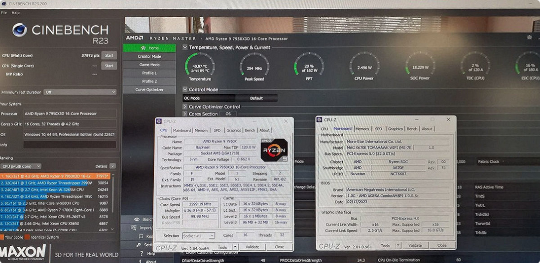 유출자는 또한 Cinebench R23 점수와 CPU-Z/Ryzen Master 스크린샷을 공유하여 누군가 실제로 7950X3D 프로세서와 MSI X670E Tomahawk 마더보드를 소유하고 있음을 확인했습니다. CPU는 멀티코어 테스트에서 37973점을 기록했습니다.