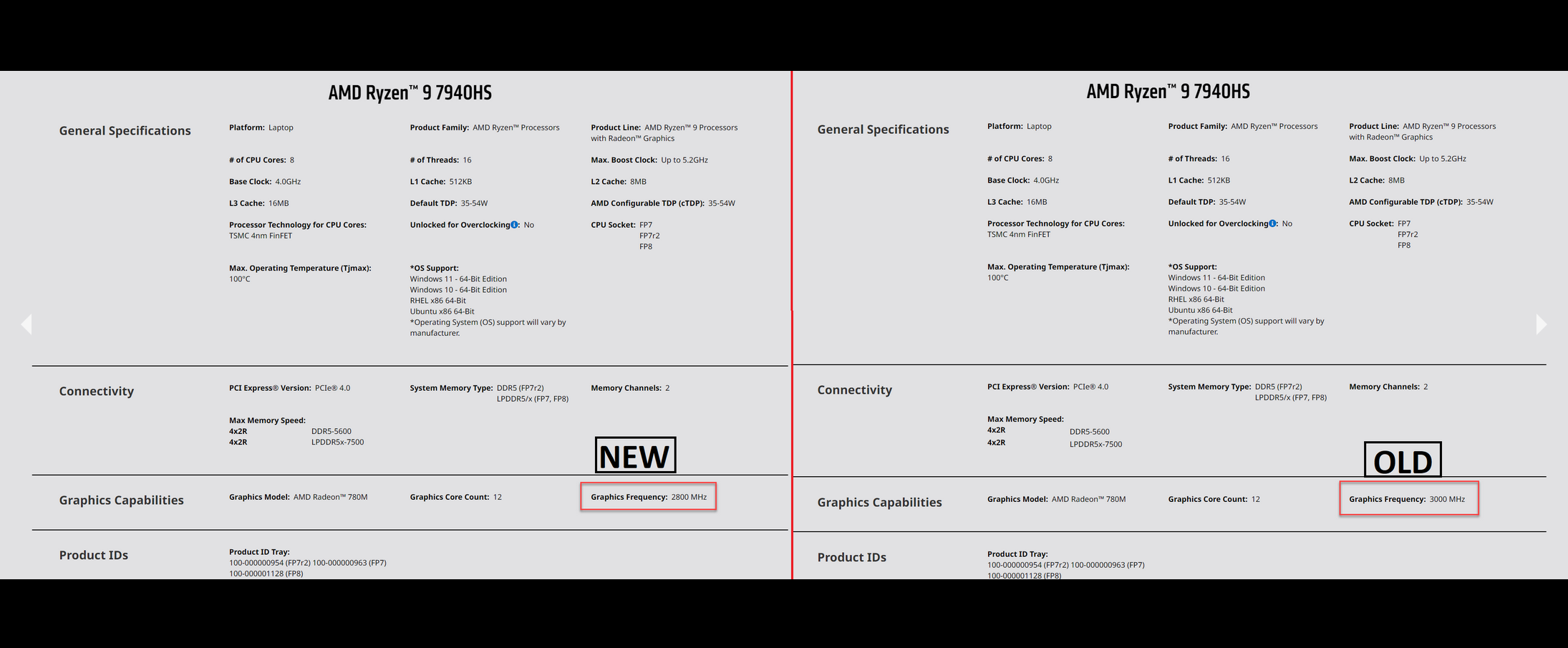AMD Ryzen 7040 "Phoenix" 라인업은 다음 달 3월에 데뷔할 예정이지만 AMD는 이제 더 낮은 GPU 클럭을 언급하는 3개의 Phoenix 칩의 제품 페이지를 업데이트한 것으로 보입니다. AMD 최고의 Phoenix CPU인 Ryzen 9 7940HS는 3.0GHz에서 2.8GHz로 -200MHz 다운그레이드되었으며 Ryzen 7 7840HS 및 Ryzen 5 7640HS도 마찬가지입니다. 따라서 AMD Phoenix CPU 중 어느 것도 이전에 언급한 3.0GHz에 도달하지 못할 것 같습니다. 여전히 칩을 3GHz 이상으로 오버클럭할 수 있지만 재고는 없습니다.