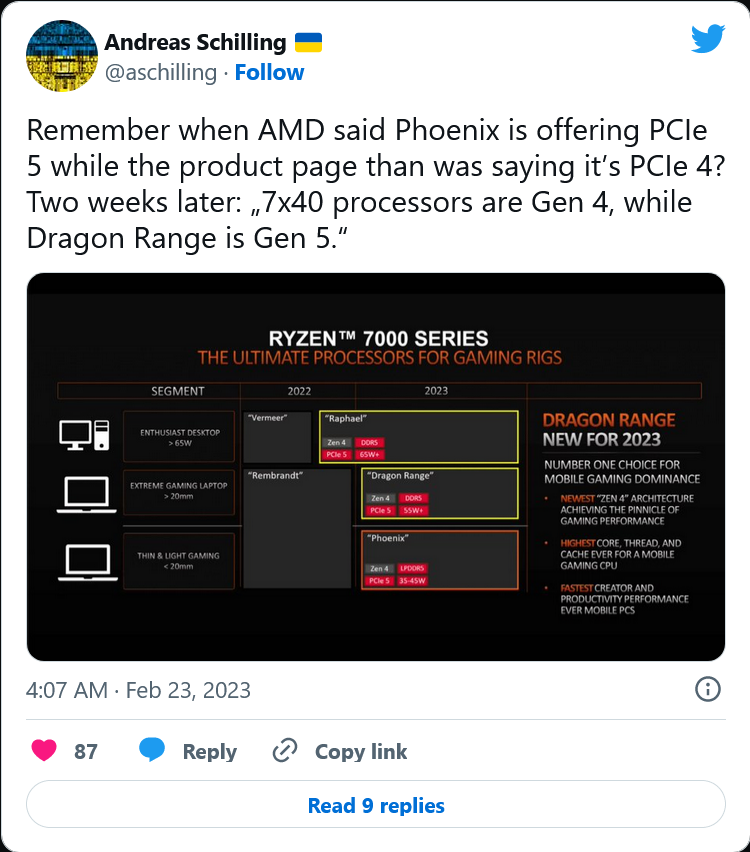 AMD Ryzen 7040 "Phoenix" CPU에서 누락될 다른 기능에 대해 Hardwareluxx의 Andreas Schilling은 칩 라인업에 약속된 PCIe Gen 5.0 기능도 제거되었다고 지적했습니다.