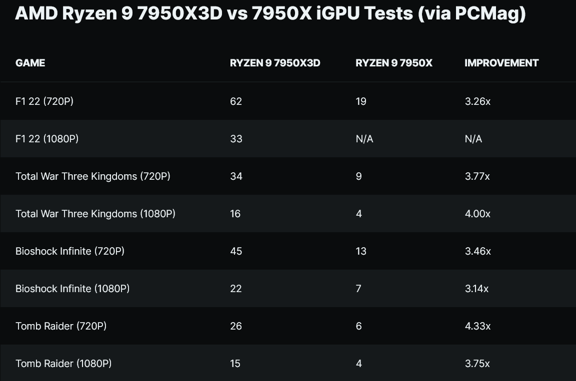 우리는 이미 표준 Ryzen 7000 데스크톱 CPU에서 이러한 칩의 스톡 및 오버클럭 성능을 확인했습니다 . PCMag는 새로 출시된 Ryzen 7000X3D CPU의 iGPU를 테스트에 사용했으며 그 결과는 말할 것도 없이 매우 매력적입니다. 게임에서 수행된 벤치마크는 3D V-Cache가 아닌 CPU에 비해 720p에서 4.3배, 1080p에서 최대 4배의 성능 향상을 보여줍니다.