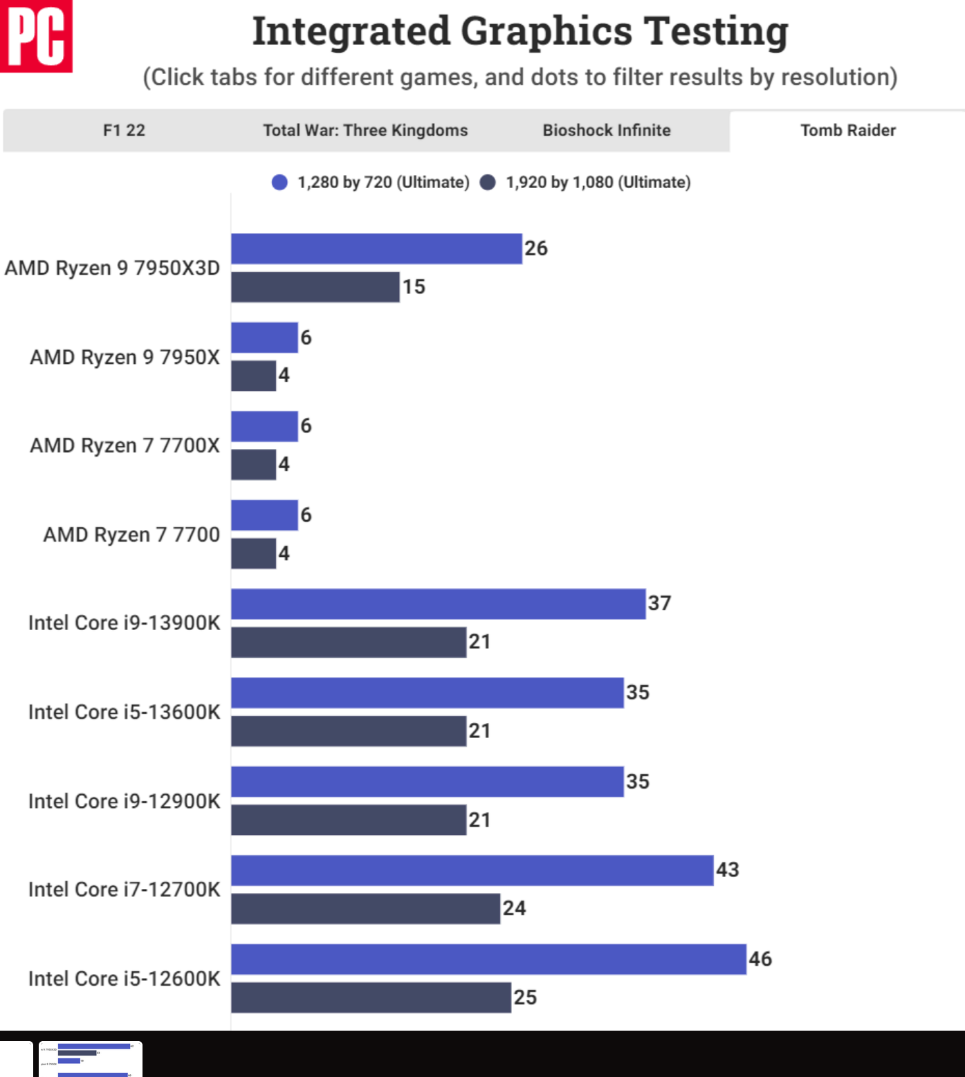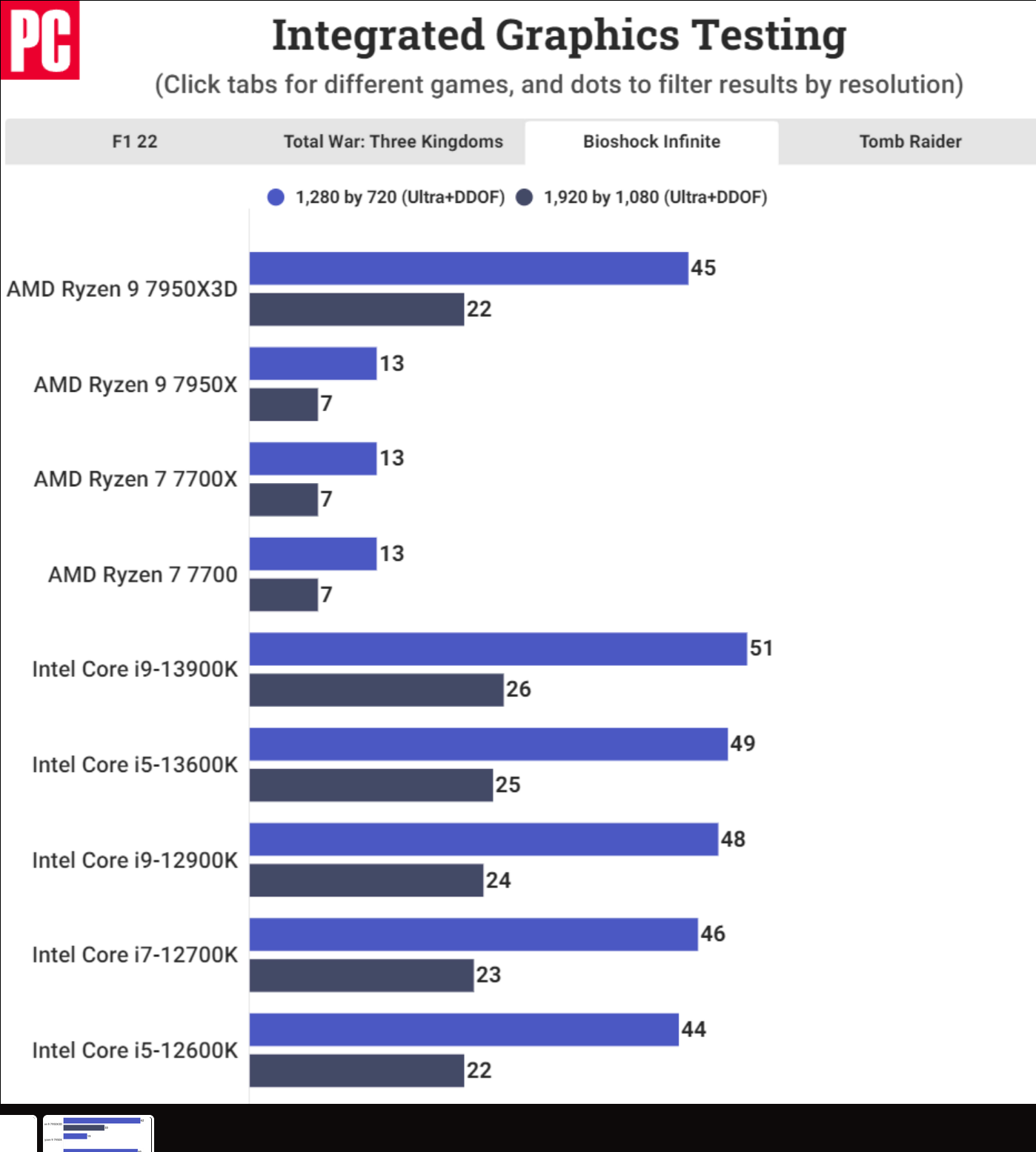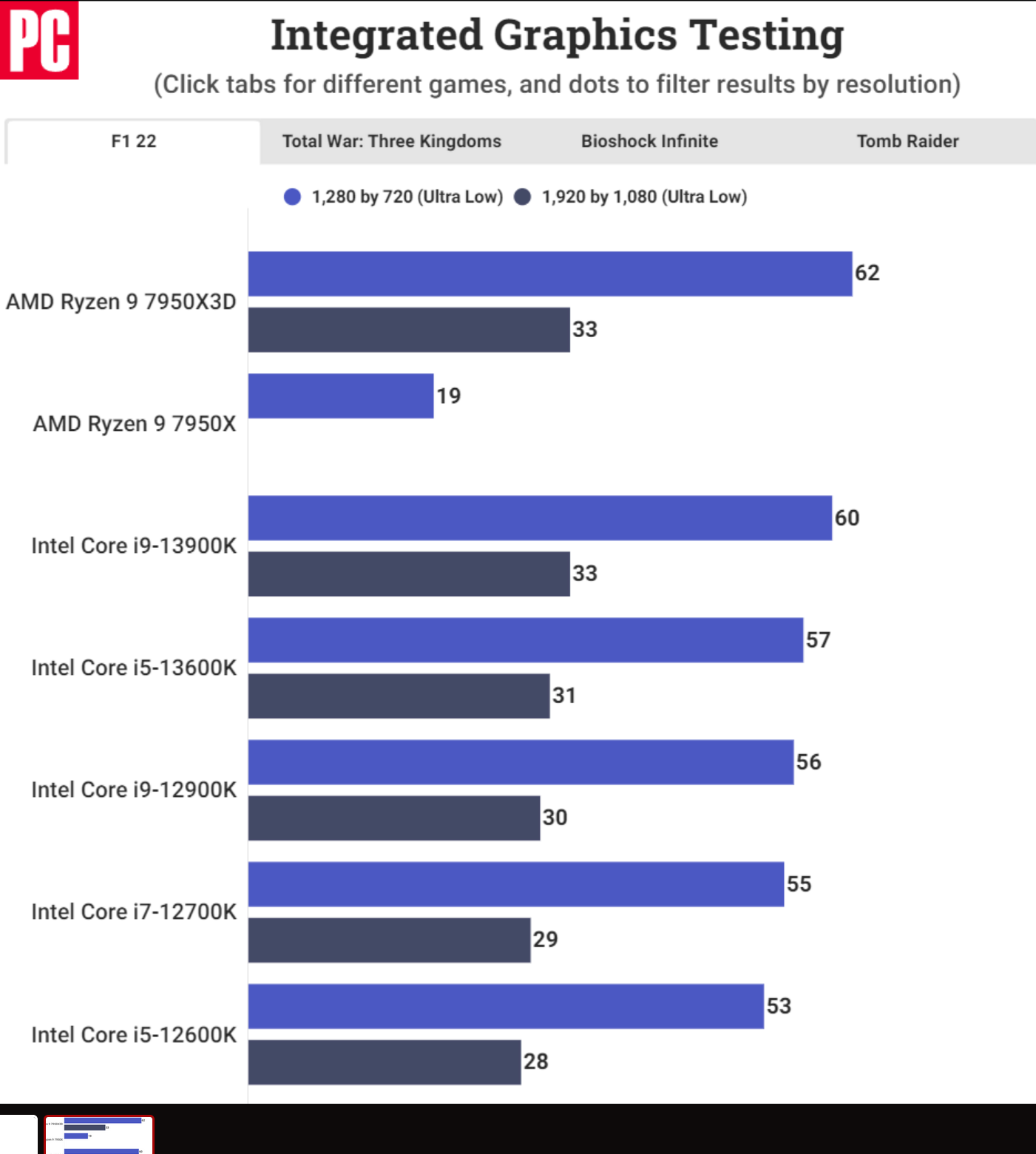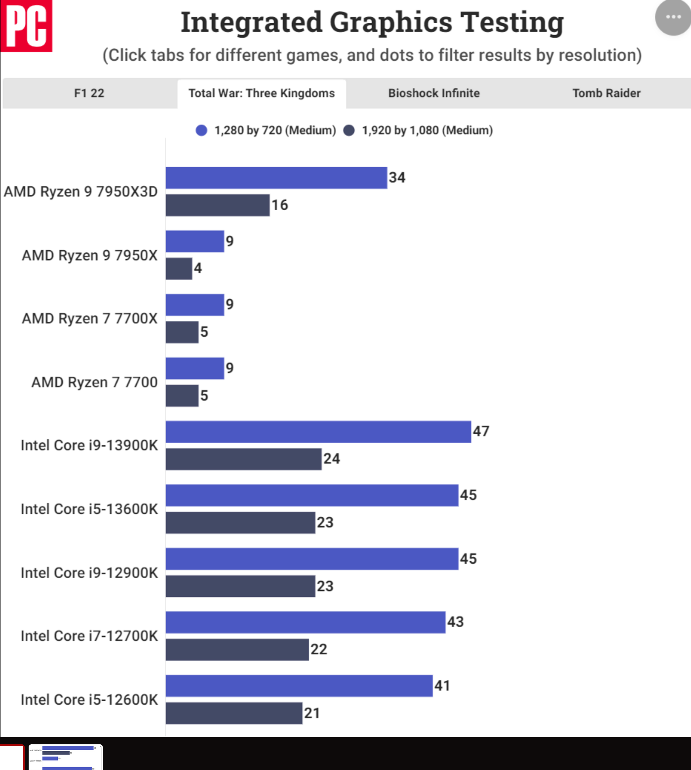 테스트에 사용된 게임으로는 F1 2022, Total War: Three Kingdoms, Tomb Raider, Bioshock Infinite 등이 있습니다. 이러한 성능 수치는 여전히 자체 데스크탑 라인업에 포함된 Intel의 iGPU와 대등하지는 않지만 이러한 급격한 성능 향상은 3D V-Cache가 APU에 가져올 수 있는 이점을 보여줍니다.
