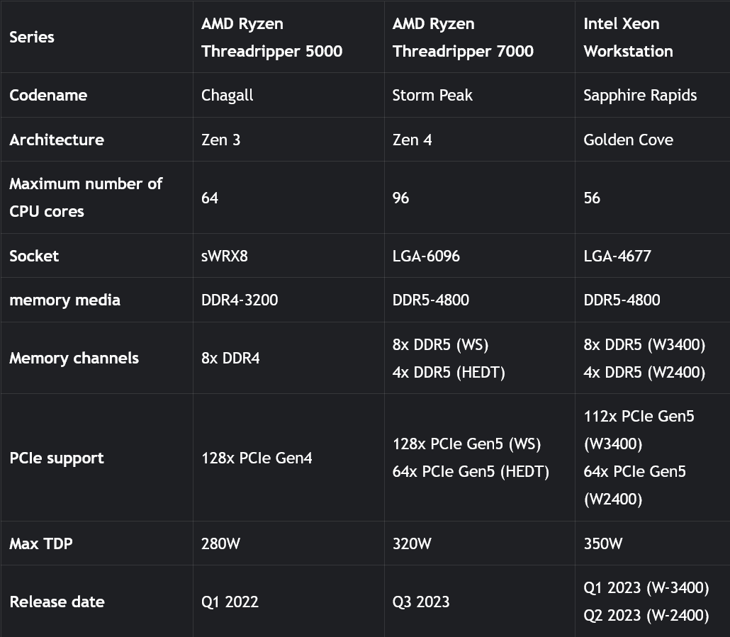 이전 라인업과 달리 HEDT 와 기업용 워크스테이션 부품 사이에 명확한 경계가 있어야 합니다 . 전자는 더 적은 수의 PCIe 레인과 8채널 DDR5 메모리를 특징으로 하는 반면, 후자는 128개의 PCIe Gen 5 레인을 8채널 DDR5 메모리와 함께 유지합니다. AMD는 공식적으로 2023년 3분기 에 Ryzen Threadripper 7000 시리즈를 출시할 계획입니다 .