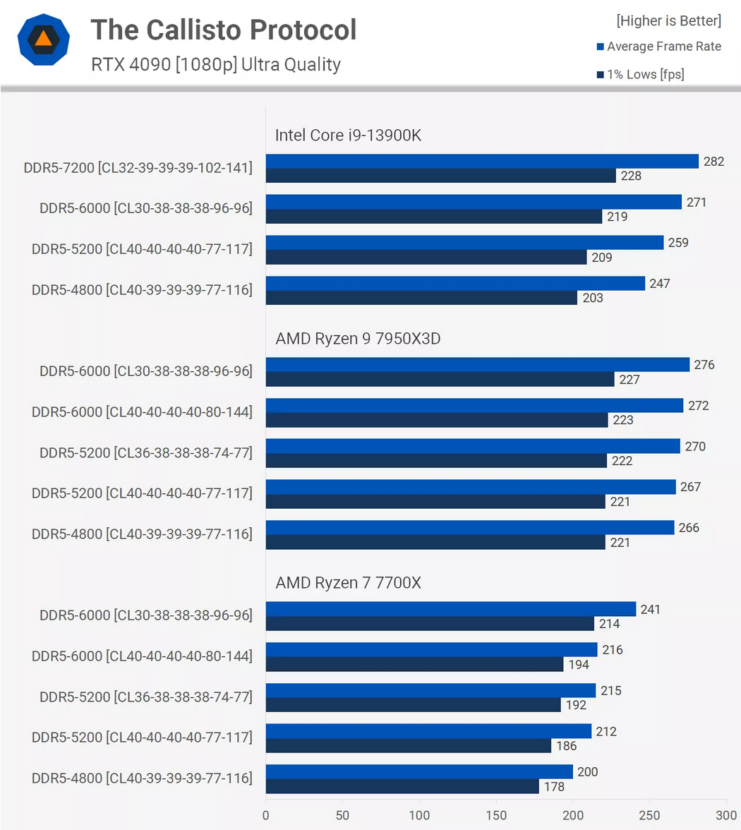 마지막으로 우리는 Callisto 프로토콜을 가지고 있으며 여기에서 13900K는 5200에서 6000 메모리로 업그레이드할 때 평균 프레임 속도가 5% 증가한 반면 7700X는 훨씬 더 실질적인 14% 향상을 보였습니다.
