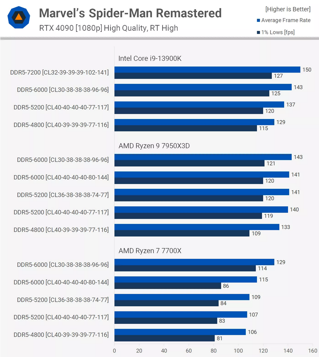 Marvel's Spider-Man Remastered는 CPU를 많이 요구하는 또 다른 게임이며, 이 예에서 Ryzen 7 7700X는 DDR5-5200에서 6000 메모리로 이동했을 때 엄청난 21%의 성능 향상을 보였습니다. 반면 13900K는 4% 향상에 그쳤으며 Zen 4가 훨씬 더 메모리에 민감하다는 것을 다시 한 번 입증했습니다.