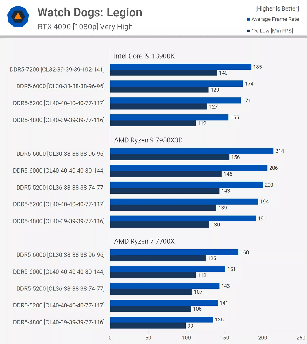 우리는 실제로 여러 게임을 통해 7950X를 실행했지만 전체 그림은 다르지 않았으므로 벤치마크 라인업에서 가장 메모리에 민감한 게임의 결과만 포함했습니다.