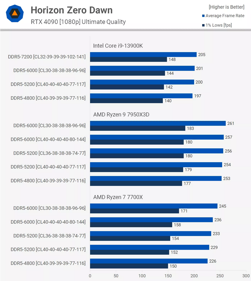 우리는 Horizon Zero Dawn이 한동안 메모리에 매우 민감한 타이틀이 아니라는 것을 알고 있었으며 이러한 결과는 Intel의 i9-13900K 스케일링이 4%에 불과하다는 것을 확인시켜 줍니다. 7700X는 DDR5-5200에서 6000으로 업그레이드할 때 7% 향상에 그쳤는데, 이는 해당 CPU에서 관찰된 가장 작은 성능 향상 중 하나입니다.