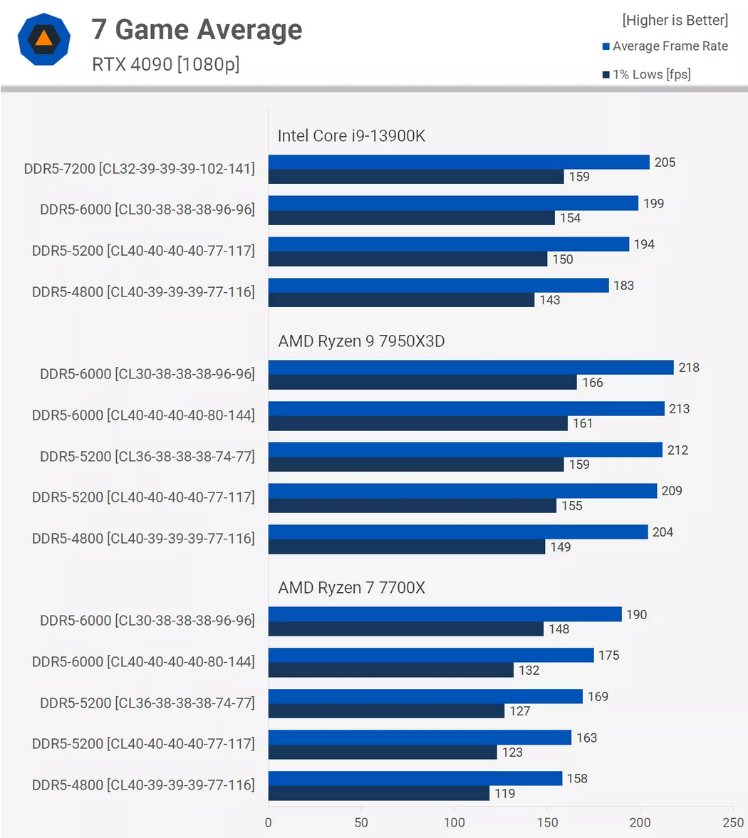 이제 테스트한 7개 게임의 전체 성능을 비교할 때 Core i9-13900K는 DDR5-5200에서 DDR5-6000 메모리로 이동할 때 평균 3%의 성능 향상을 보인 반면 Ryzen 7 7700X는 훨씬 더 많은 17%의 성능 향상을 보였습니다. .
