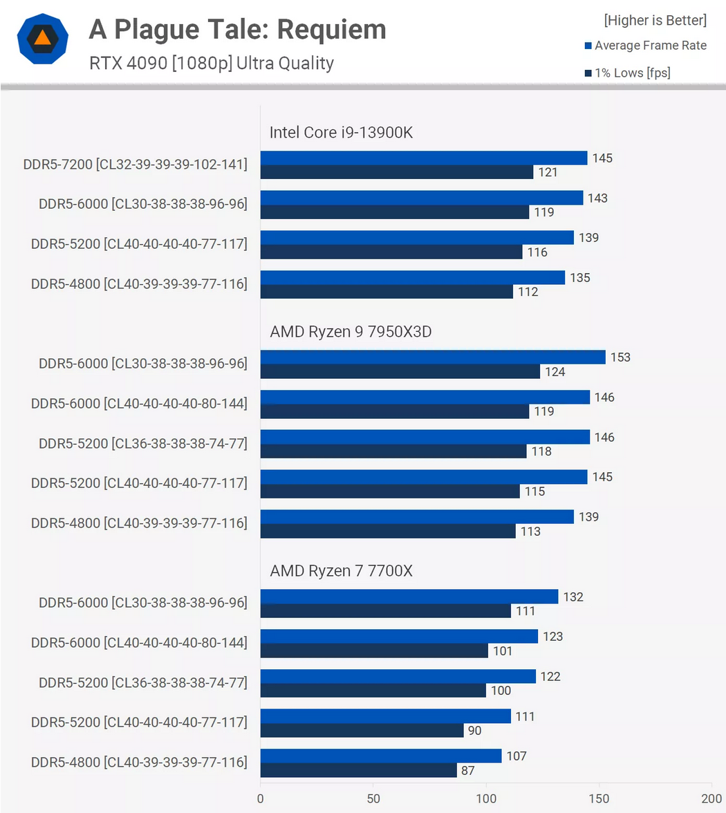 A Plague Tale: Requiem은 CPU를 심각하게 로드하는 게임이며, 이것은 7700X가 긴 대기 시간, 낮은 대역폭 메모리로 인해 실제로 어려움을 겪은 또 다른 예이며, 5200에서 6000으로 이동할 때 거의 20% 향상되었습니다.