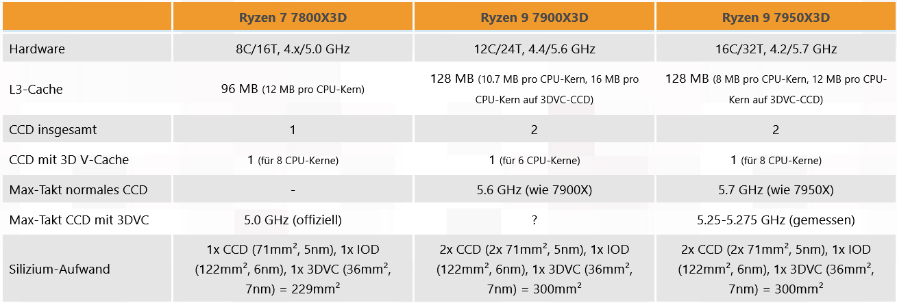 반면 Ryzen 9 7900X3D 및 7950X3D의 경우 3DVD CCD의 시계에 대한 공식 정보가 없습니다. Ryzen 9 7950X3D에 대한 Hardwareluxx 및 Tom's Hardware의 측정 결과 3DVD CCD의 경우 5.2GHz, ComputerBase의 경우 5.275GHz까지 나타났습니다. 그러나 이것은 최대 5.7GHz까지 클럭할 수 있는 일반 Ryzen 9 7950X에 비해 여전히 눈에 띄는 클럭 속도 단계입니다. 더 큰 X3D 모델에서 이 효과를 완화하기 위해 AMD는 우아한 트릭을 결정했습니다. 12코어와 16코어를 사용하면 하나의 CCD에만 3D V-캐시가 있고 다른 CCD는 무료입니다. 이를 통해 후자가 일반 X 모델의 높은 클럭 속도에 다시 도달할 수 있습니다.