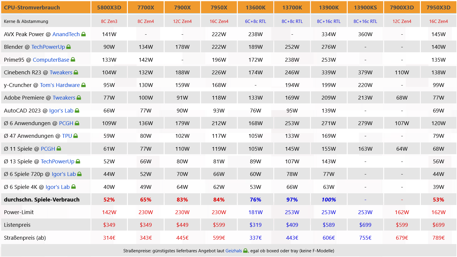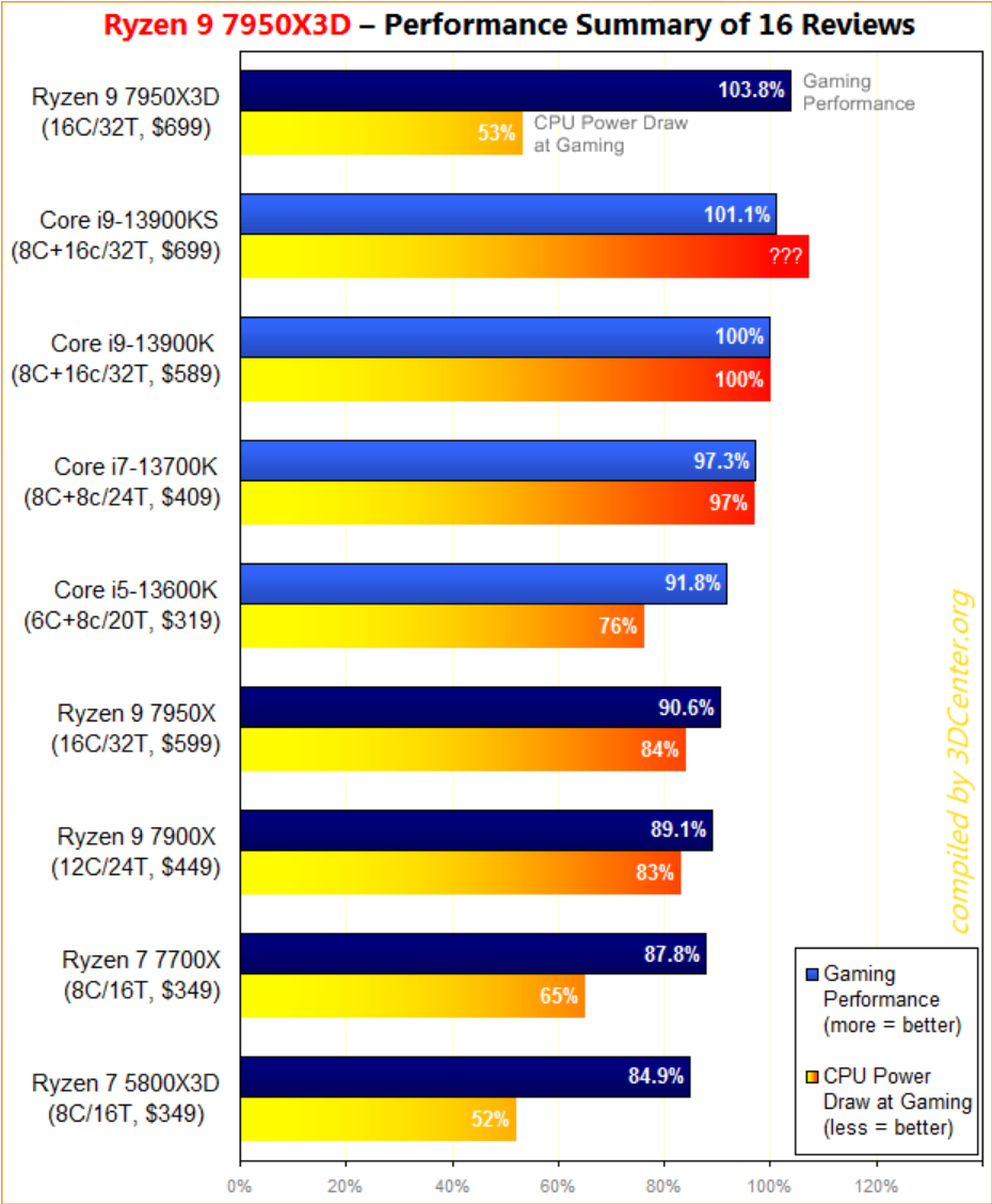 다시 한 번 AMD가 성능을 달성하는 에너지 효율성은 탁월합니다. 이 점에서 일반 Ryzen 7000 프로세서는 나쁘지 않지만 Ryzen 9 7950X3D는 절대적으로 최고의 영광입니다. 게임에 사용될 때 에너지 절약 라벨이 정말 의심스럽습니다. AMD 및 Intel의 최신 최고 프로세서의 높은 전력 소비 값에 대해 궁금하다면 잘 찾아오셨습니다. 그리고 특히 게임과 관련하여 Ryzen 9 7950X3D는 꿈의 에너지 효율성 등급을 달성했습니다. 게임에서 평균 53%의 전력 소비로 Core i9-13900K보다 약간 더 나은 게임 성능은 거의 두 배(!)의 에너지를 소비합니다. 능률.
