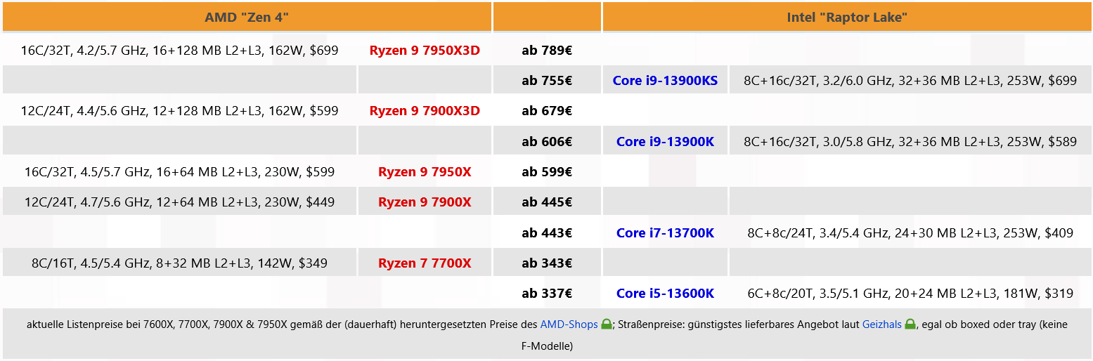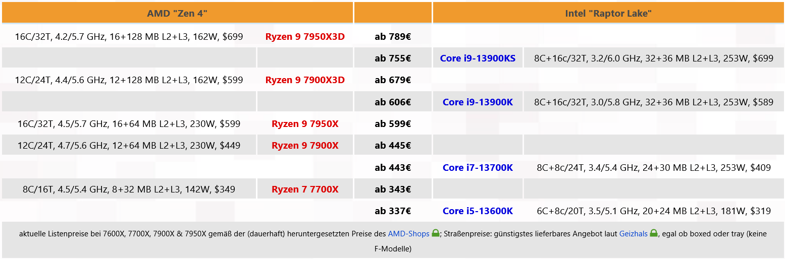 이것은 또한 가격 상황에 영향을 미칩니다. 상품이 부족할 때 소매업체는 자연스럽게 거래를 감지하고 상황이 오래 지속될수록 이에 따라 상점 가격을 더 높게 책정하기 때문입니다. 어떤 경우에는 Ryzen 9 7950X3D에 대한 "제안"이 이미 900유로 이상으로 나타났습니다. 소매업체가 더 높은 가격대에 부딪히지 않거나 AMD가 납득할 수 있는 배송 수량으로 가능한 한 빨리 이 요청을 중단하기를 여전히 희망합니다. 그러나 상품 부족으로 인한 가격 인상 없이도 Ryzen 9 7900X3D 및 7950X3D는 저렴하지는 않지만 현재 가장 비싼 소비자 프로세서 중 하나입니다. 예를 들어 Ryzen 9 7900X3D도 독일 소매점에서 Core i9-13900K보다 80유로 이상 비쌉니다. 물론 이것은 다음을 요구합니다.