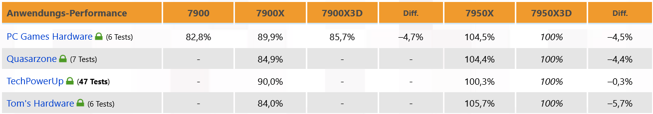 응용 프로그램 성능 분야는 이러한 프로세서의 대상 영역이 아니기 때문에 간단히 다루겠습니다. 일반 X 모델이 이에 더 적합하고 비용도 훨씬 저렴합니다. 새로운 X3D 모델의 경우 이 분야의 유일한 질문은 응용 프로그램의 성능 단점을 가능한 한 작게 유지할 수 있는지 여부입니다. 이것은 Ryzen 9 7950X3D에서 합리적인 규모로 작동하는 것 같습니다. PCGH, Quasarzone 및 Tom's Hardware의 강력한 멀티스레드 벤치마크는 4~6%의 성능 저하를 보이는 반면, TechPowerUp의 매우 광범위한 테스트 필드는 , -0.3%에서만. 즉, 특히 가능한 최고 클럭 속도가 중요한 몇 개의 코어에 대한 벤치마크에서 "X3D 스케줄러"