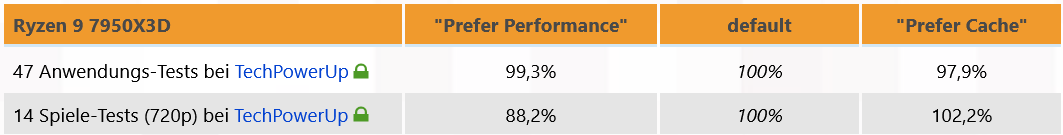 "AMD 3D V-Cache Performance Optimizer"라는 추가 "X3D 스케줄러"가 포함된 AMD의 새로운 칩셋 드라이버(게임 모드 및 Windows 10/11의 "Xbox Game Bar" 앱과 협력 ). 이 스케줄러는 처음에는 사용자와 독립적으로 작동하지만 일반 및 응용 프로그램별로 제어할 수 있습니다. 필요한 경우 이를 사용하여 AMD가 지정한 것과 다른 결정을 내릴 수 있습니다. 그런 다음 Ryzen 9 7900X3D 및 7950X3D를 일반적으로 일반 CCD("Prefer Performance") 또는 3DVC-CCD("Prefer Cache")에서 작동하는 것도 가능합니다. 그러나 AMD는 적어도 응용 프로그램에 대해 거의 최적인 것으로 보입니다.TechPowerUp의 테스트에 따르면 기본 설정이 다른 두 옵션보다 더 잘 실행됩니다. 게임의 경우에만 AMD가 화면에 모든 애플리케이션을 표시하지 않을 수 있습니다."캐시 선호" 옵션이 드라이버 기본값보다 약간 더 나았습니다.