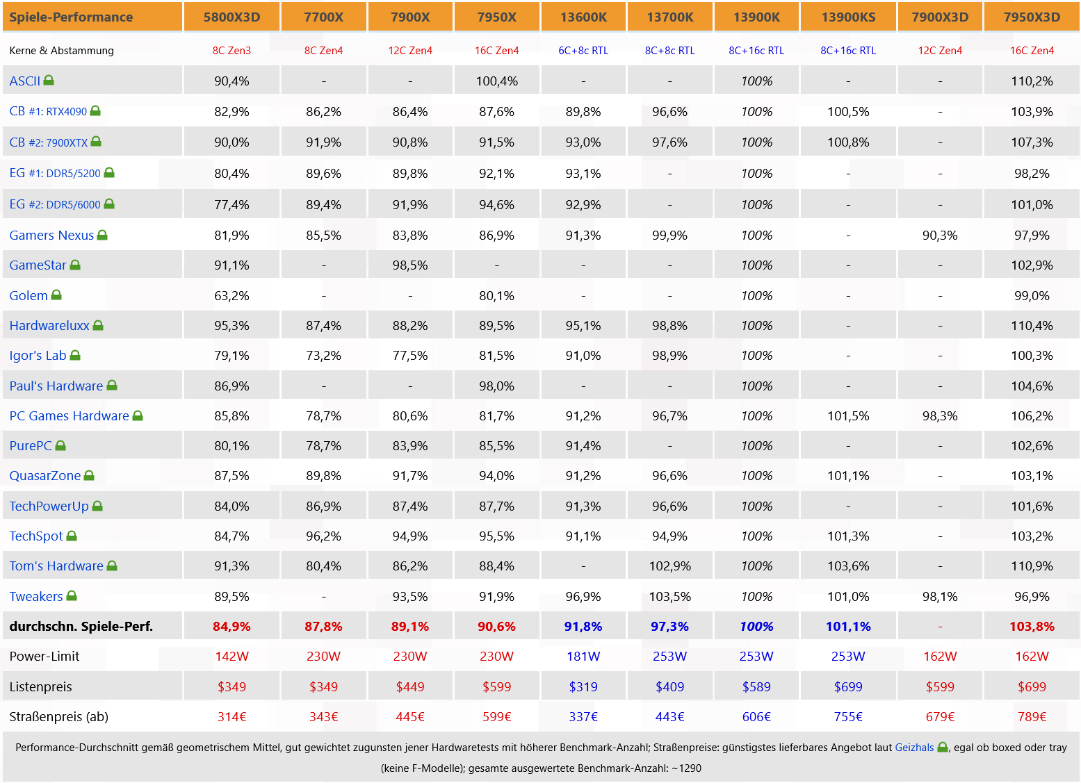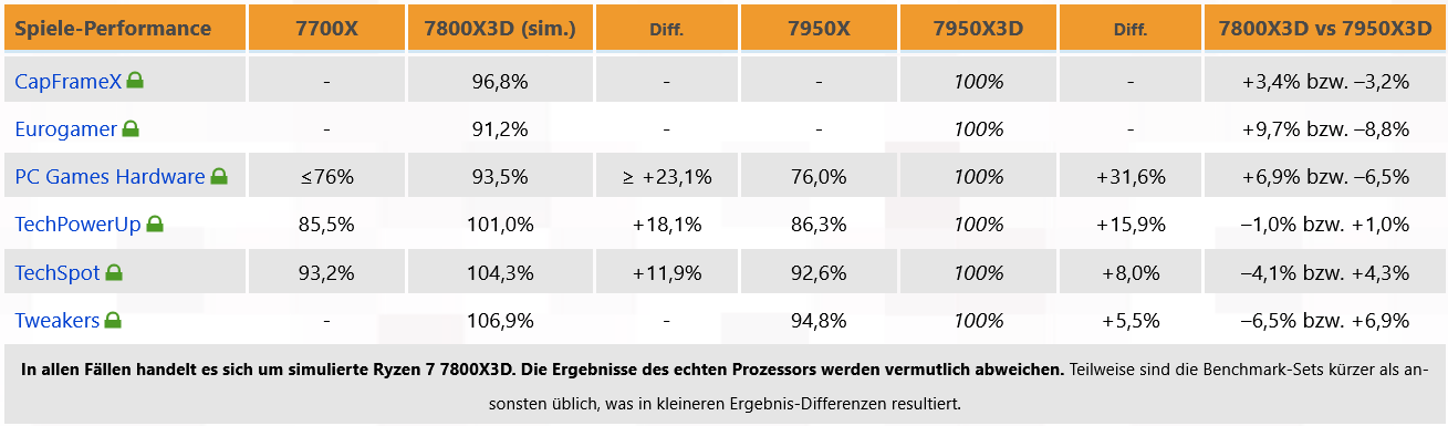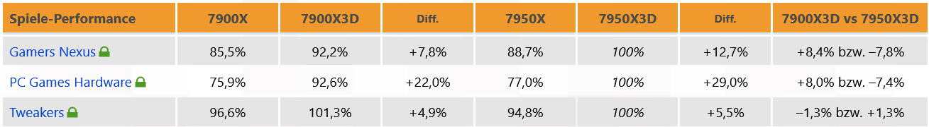 불행히도 사용 가능한 테스트의 수는 더 작은 Ryzen 9 7900X3D의 일반적인 평가를 하기에는 여전히 너무 적습니다. 그런 다음 일반 X 모델과 Ryzen 9 7950X3D와의 차이점을 고려하여 명시적으로 다시 평가했습니다. 두 개의 테스트 보고서는 7900X3D와 7950X3D 간의 눈에 띄는 성능 차이에 대해 거의 일치하지만 세 번째 테스트 보고서에서는 두 개의 새로운 X3D 프로세서 간에 작은 차이만 보입니다. 여기서 결정적인 것은 없습니다. 각 세대의 상위 모델이 게임 성능에 큰 차이를 보이지 않는다는 이전 Ryzen 규칙을 제외하고는, 이 경우 아마도더 이상 적용되지 않습니다. 그러나 Ryzen 9 7900X3D에 대한 추가 테스트 보고서가 없으면 이에 대해 정말 결정적인 것은 없습니다.