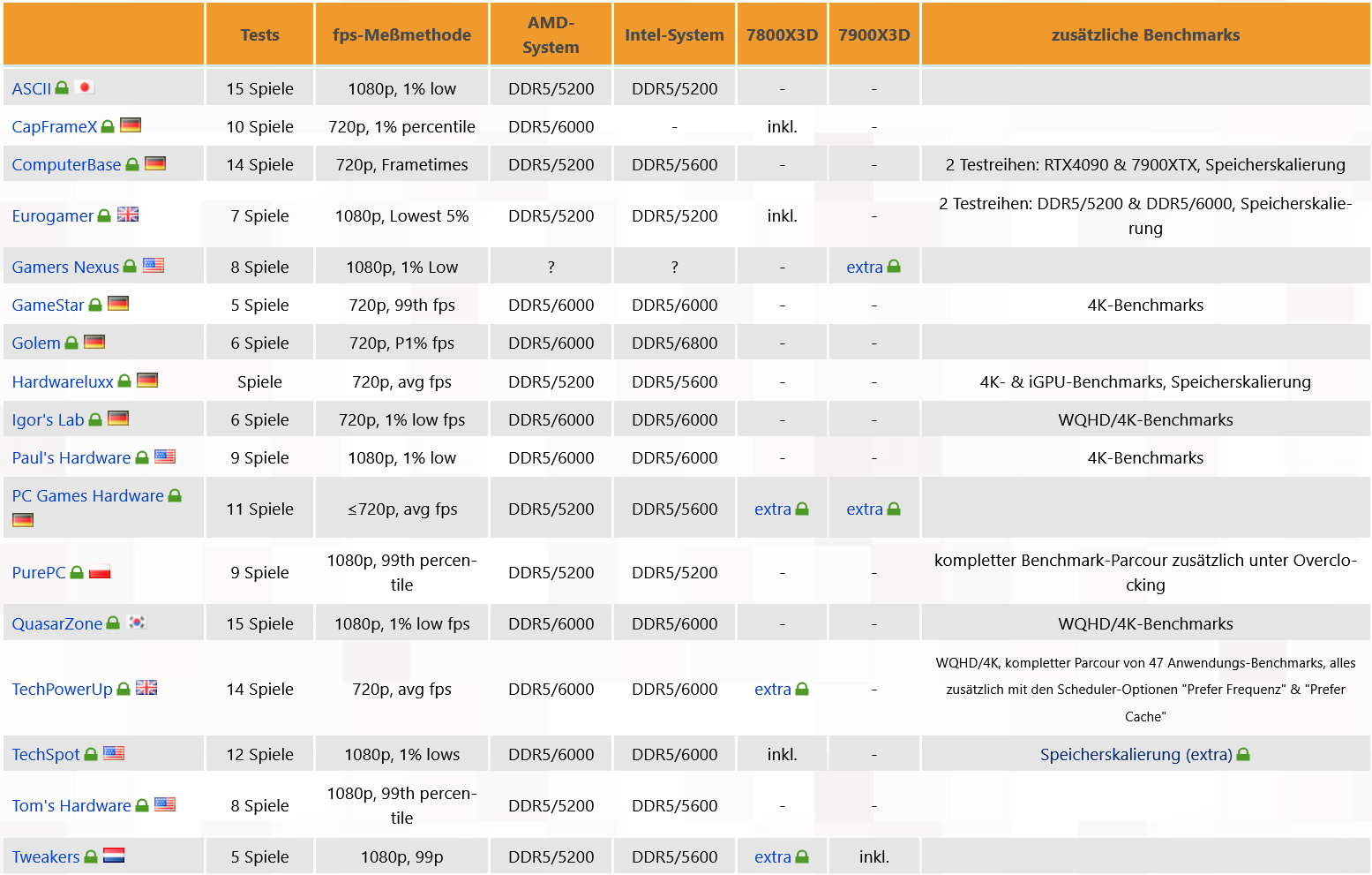 DDR5/5200에서 한 번, DDR5/6000에서 한 번 일관되게 수행된 Eurogamer의 벤치마크에서 볼 수 있듯이 테스트에 사용된 메모리는 대략적인 그림에서 중요한 역할을 하지 않았습니다. 반면 AMD와 nVidia 그래픽 카드 사이에는 흥미로운 차이점이 있습니다. 이에 대해 ComputerBase는 지속적인 테스트 시리즈를 제공합니다. 반면 Ryzen 9 7950X3D의 일반적인 경향은 최소 프레임 속도에서의 결과가 일반적으로 평균 프레임 속도보다 약간 나빴습니다. Igor's Lab 보다 이 효과가 더 분명한 곳은 없었습니다.720p 미만에서 Ryzen 9 7950X3D는 평균 프레임 속도에서 Core i9-13900K에 +7.2% 손실되었지만 최소 프레임 속도에서는 +0.3%에 불과했습니다. 다른 하드웨어 테스터의 경우 이 차이가 훨씬 작았으며 이것이 발견된 가장 큰 차이입니다. 이미 언급한 바와 같이 위의 벤치마크 평가에는 주로 최소 프레임 속도가 포함되며 예외는 평균 프레임 속도가 더 나은 성능 확장을 나타내는 경우에만 관련됩니다. 모든 곳에서 평균 프레임 속도를 사용했다면 Ryzen 9 7950X3D가 약간 더 잘 나올 수 있습니다.