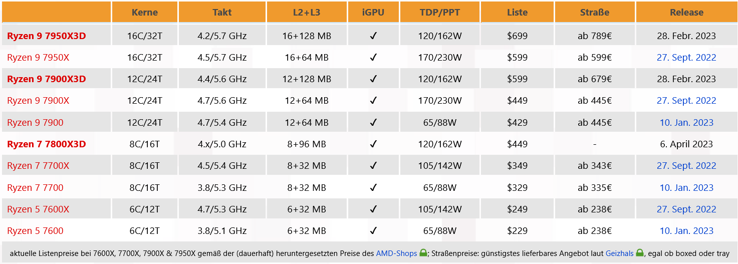 소매점에서 이러한 가격 차이는 훨씬 더 두드러집니다. 일반 X 모델은 지난 가을부터 시장에 출시되었으므로 소매점 간의 일일 가격 전쟁에서 수정된 AMD 정가에 훨씬 더 많은 시간을 할애할 수 있었습니다. 이것은 독일 소매점의 일반 X 모델이 현재 AMD 자체보다 약 12% 저렴하다는 것을 의미합니다. 반면에 새로운 X3D 프로세서는 판매 시작과 동시에 출시되었습니다.변환된 미국 정가와 거의 동일한 공식 MSRP 주변에서 제공됩니다. 여기에서 "엉성한" 가격의 Ryzen 7000X와 정가 수준의 Ryzen 7000X3D가 서로 대면합니다. 게다가 라이젠 9 7950X3D는 1차 출고 물량이 꽤 빨리 품절되고 후속 상품도 항상 꽤 빨리 소진된다는 점을 가지고 있어서 현재는 프로세서가 거의 재고가 없는 품목으로만 나와 있습니다.