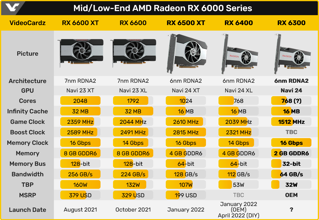 하드웨어 애호가들은 공식 사양이 없음에도 불구하고 이 모델에 대한 기본 데이터를 발견하는 데 성공했습니다. 노트북 RX 6300M 모델과 같은 GPU 주파수를 갖췄을 뿐만 아니라 메모리 사양도 2GB 32비트 버스와 동일하다. 흥미로운 점은 이 모델이 RX 6400 데스크탑(14Gbps)에 비해 더 빠른 2000MHz(16Gbps) 메모리를 가지고 있다는 것입니다. 그러나 제한된 버스로 인해 메모리 대역폭은 64GB/s에 불과합니다.