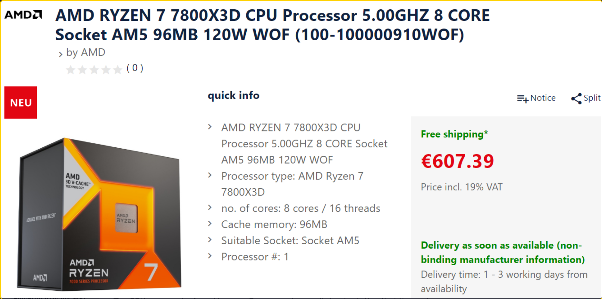 그러나 7800X3D의 비용이 훨씬 더 많이 드는 경우도 있습니다. 독일 매장에는 이 부품이 607유로에 나와 있지만 800유로가 넘는 동일한 CPU도 쉽게 찾을 수 있었습니다. 물론 더 높은 가격은 유럽의 최종 가격이 아니라 자리 표시자임을 의미합니다.