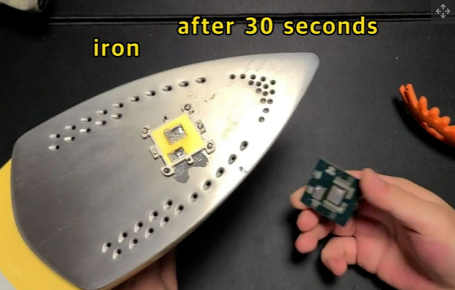 2단계에서는 또 다른 일반적인 가정용 기기인 다리미를 사용합니다. 다리미 표면이 위를 향하도록 가열하여 플랫폼을 만든 다음 CPU IHS에 서멀 페이스트의 작은 덩어리( 치약을 사용하는 것은 권장하지 않음 )를 추가하고 뜨거운 표면에 놓습니다(IHS-down). 철의. "30초"만 지나면 IHS는 아주 적은 노력으로 분리할 준비가 됩니다. 영상에서 타씨햄은 스파게티 집게를 몇 개 사용했는데 대부분의 집게나 집게가 부드러운(플라스틱, 나무) 손잡이가 있는 집게가 적당할 것 같다. 아쉽게도 Tassi Ham은 이 부분을 더듬어 책상 위에 떨어진 CPU를 떨어뜨렸지만 아무런 피해가 없는 것으로 보입니다.