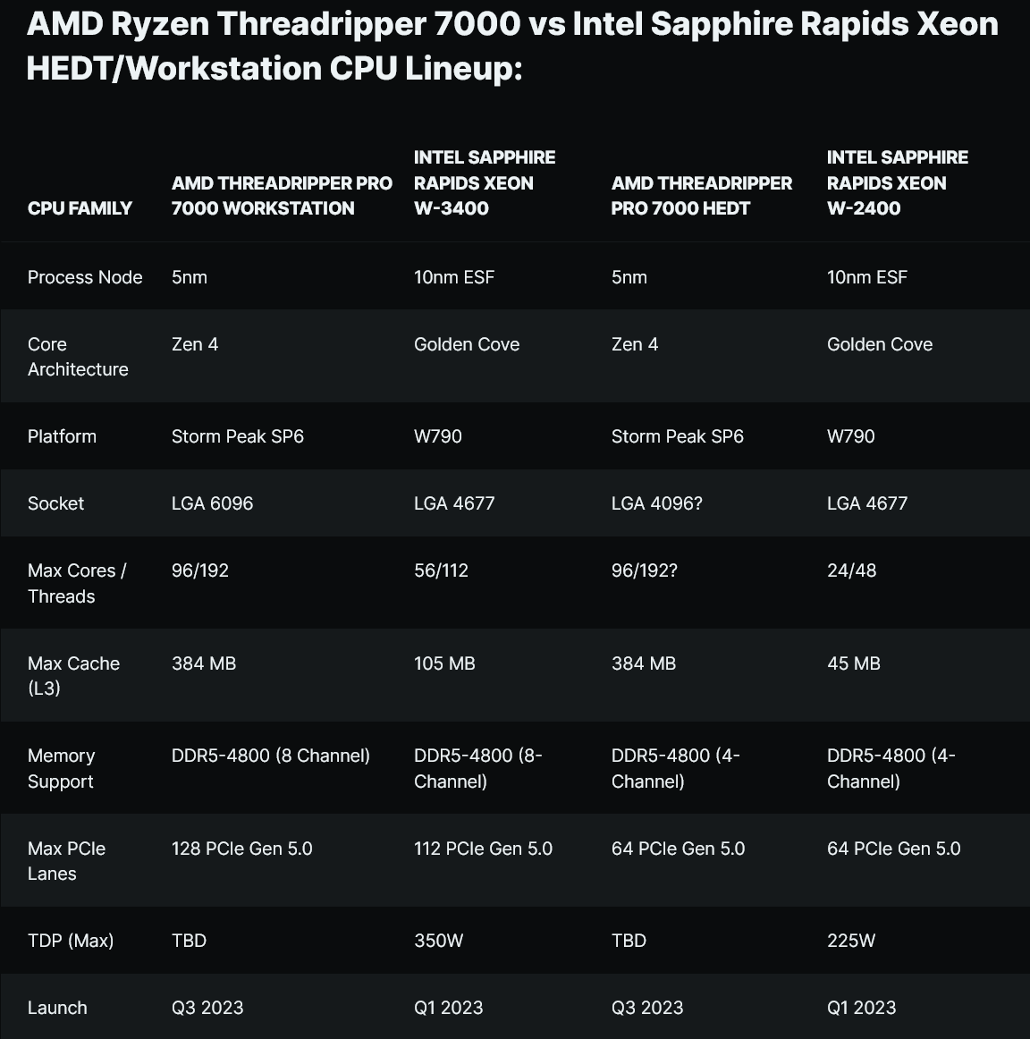 AMD가 HEDT 제품군에 전체 96코어 Zen 4 부품을 제공할지는 두고 봐야 하지만 그렇게 된다면 최대 24코어만 제공하는 Intel의 Xeon W-2400에 큰 타격을 줄 것입니다.