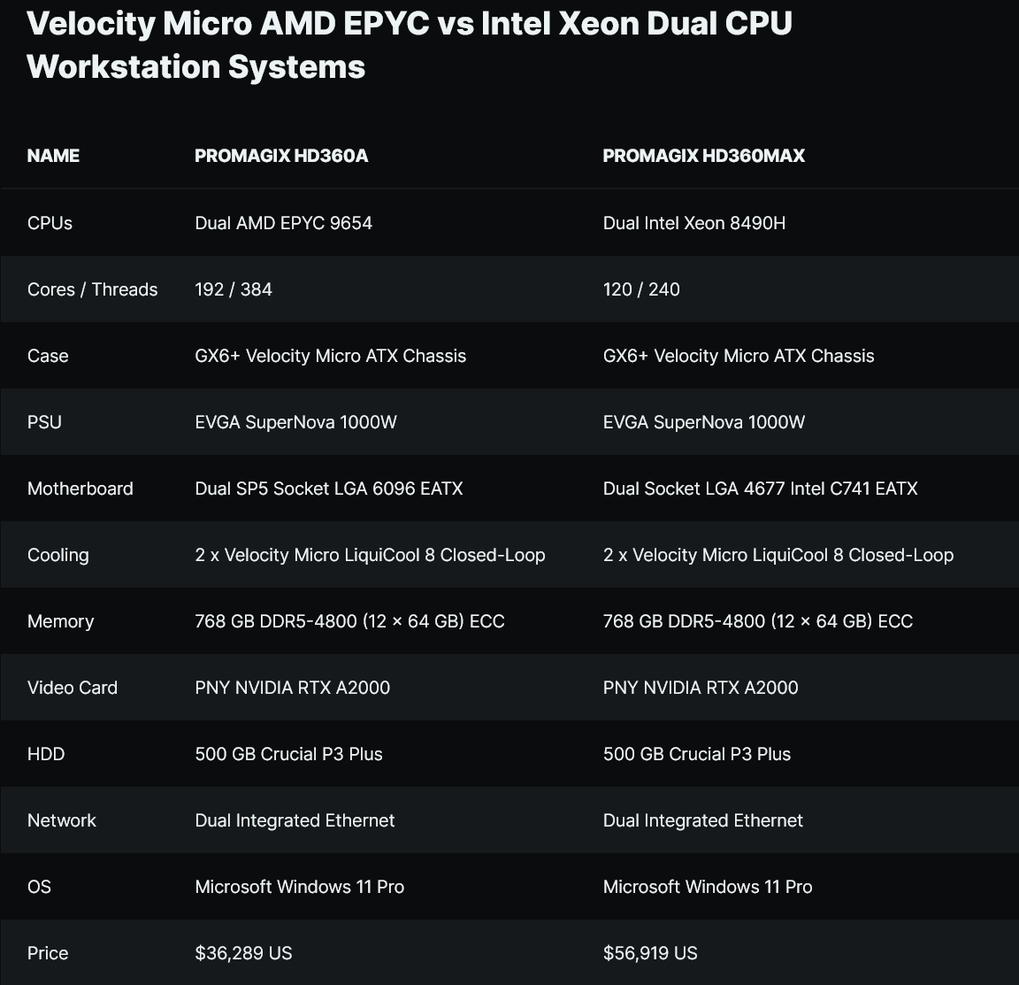 Velocity Micro의 듀얼 AMD EPYC 192코어 워크스테이션 소매가는 미화 약 $36,000, 듀얼 Intel Xeon Sapphire Rapids 시스템은 $56,000부터 시작합니다.