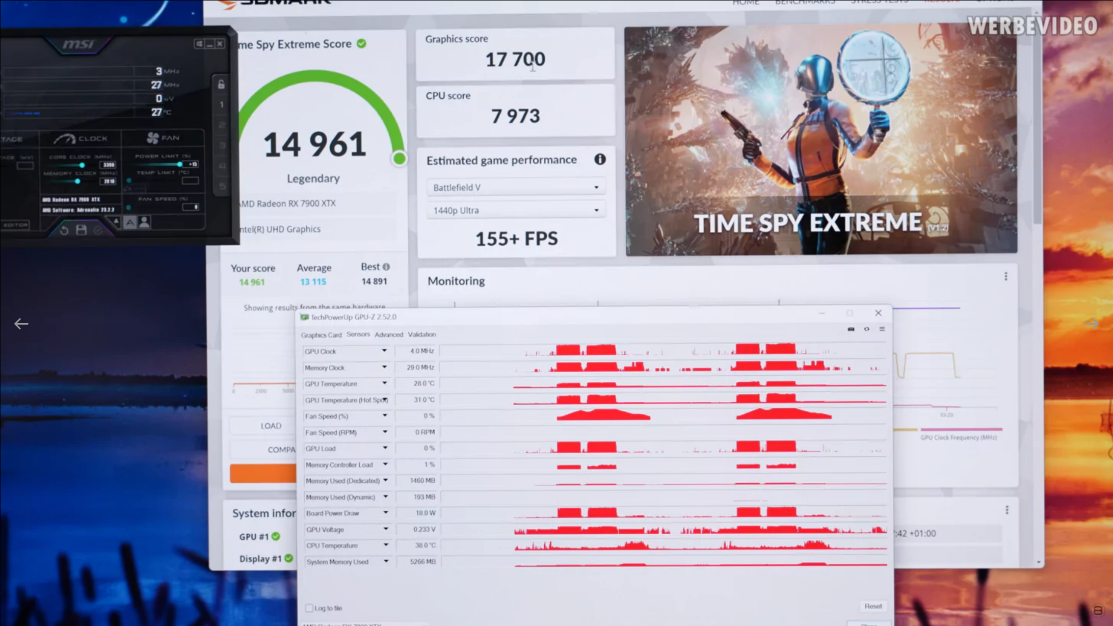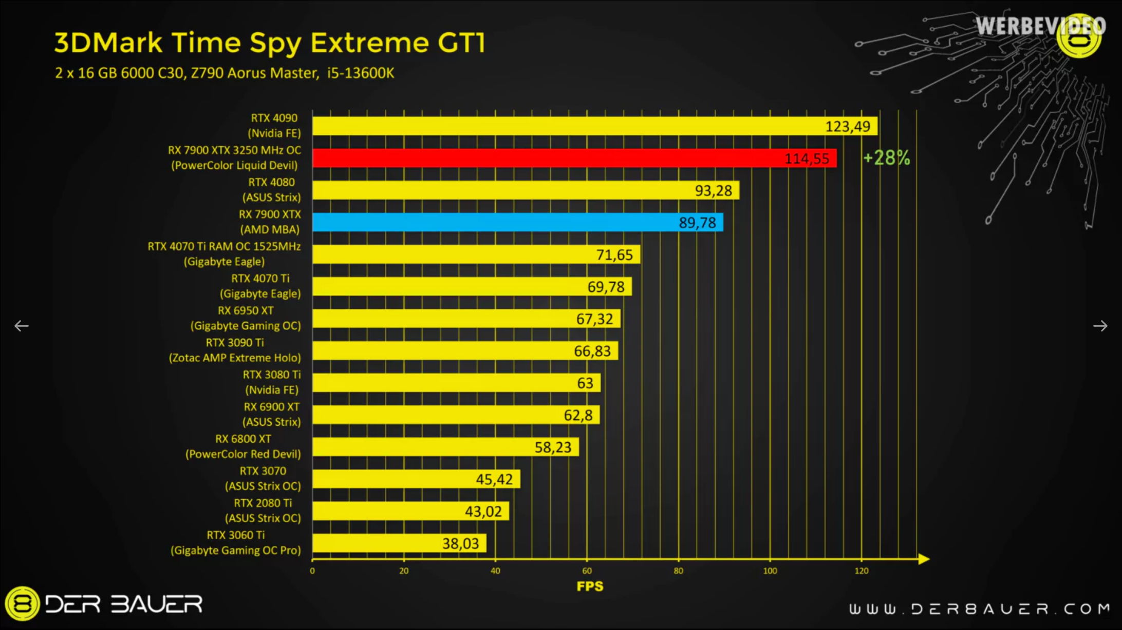 최종 설정을 실행하면서 Der8auer는 AMD Radeon RX 7900 XTX가 전력 제한에 쉽게 도달할 수 있다고 말합니다. GPU는 3.2GHz(3244MHz)의 오버클럭에 도달하고 전력 소비량은 약 650W에 이릅니다. 이는 표준 TBP인 355W의 거의 두 배입니다. 그래픽 카드는 3DMark Time Spy Extreme 벤치마크에서 17,000점을 획득하여 명예의 전당에서 13위에 올랐습니다 . 게임에서 GPU는 약 3.4GHz에서 정점을 찍었습니다.