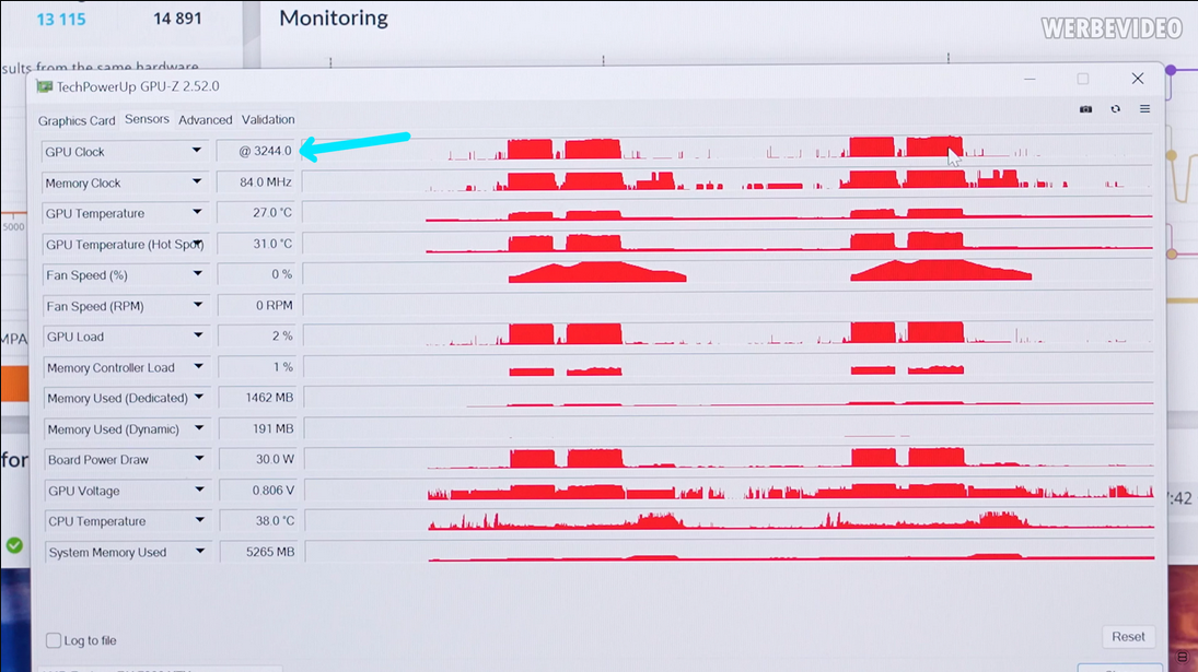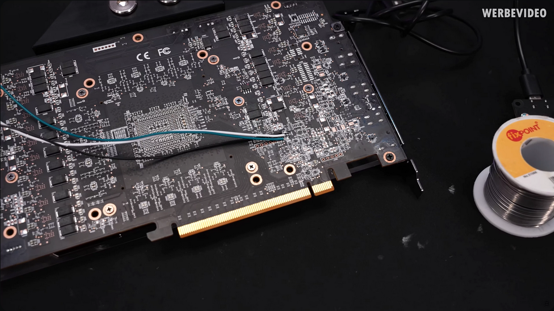 첫 번째 테스트는 +15의 표준 전력 제한 상승으로 수행되어 카드가 400W 이상의 전력을 사용하고 약 3GHz의 클럭킹을 기록했습니다. EVC 모듈을 사용하여 Der8auer는 하드 록된 카드의 전압을 조정할 수 있습니다. 1.045V에서 그래픽 카드는 약 500와트이지만 3050MHz에 가까운 약간 더 높은 클럭 속도를 제공했습니다.