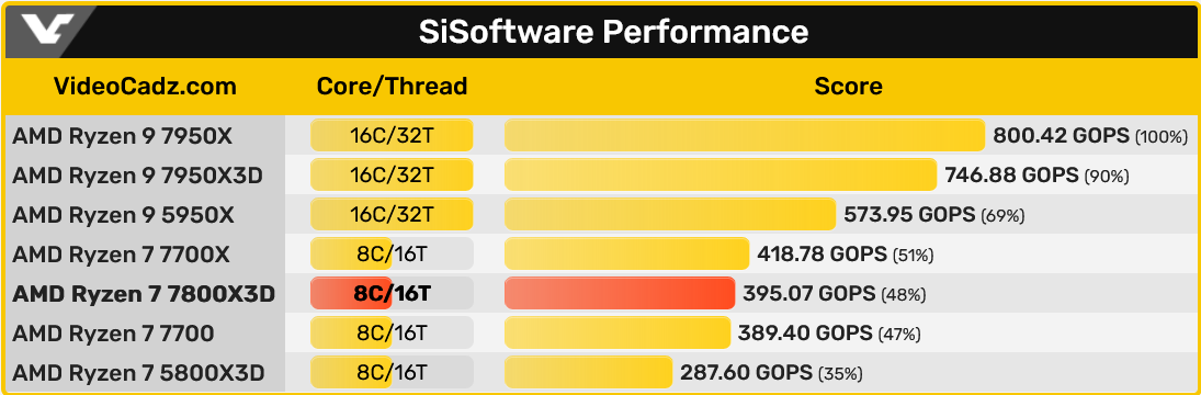 집계된 '점수'를 비교할 때 Ryzen 7 7800X3D Zen4 SKU는 5800X3D Zen3 모델보다 37.3% 빠릅니다. 공식 순위에 따르면 395 GOPS 점수는 Ryzen 7 7700X와 7700 non-X SKU(둘 다 8코어 Zen4 데스크톱 CPU) 사이에 있습니다.