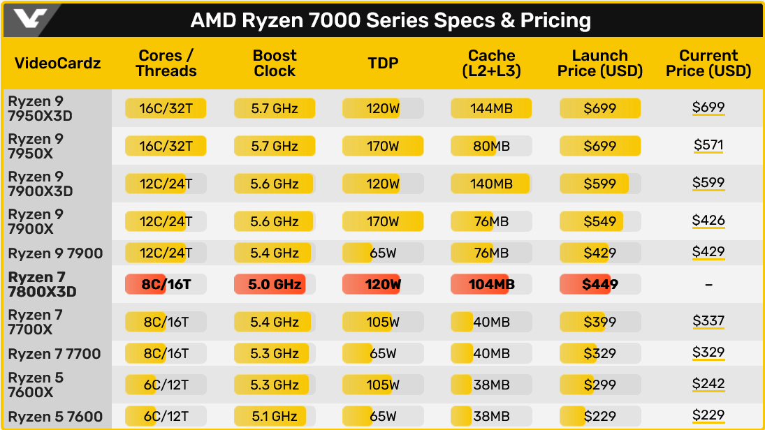7800X3D는 4월 6일 $449에 출시될 예정입니다. 이는 7700X SKU보다 $112 더 많고 7900보다 $20 더 많습니다.