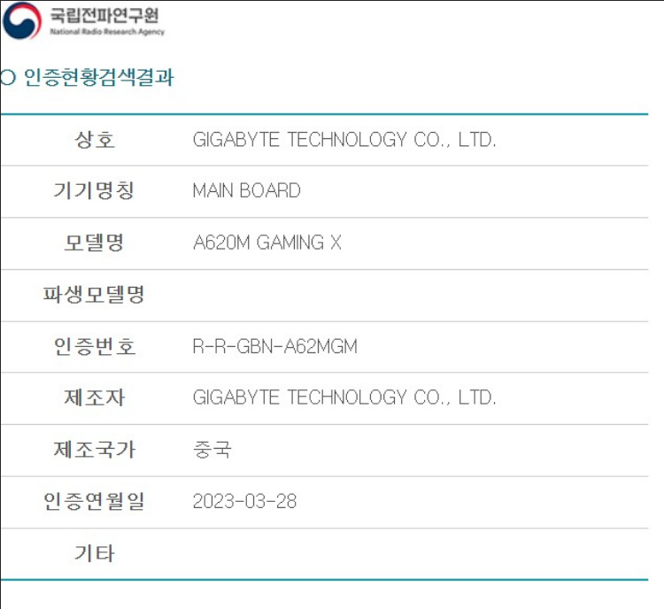 전파인증된 메인보드는 GIGABYTE A620M GAMING X로 향후 더 많은 메인보드가 포착될 것으로 보입니다.