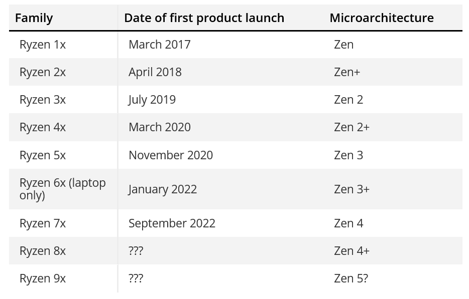 AMD는 최근 중단된 메인스트림 데스크탑, 비 APU, Ryzen 프로세서 출시 일정을 따랐습니다. 예를 들어 데스크톱 CPU용 Ryzen 4000 또는 Ryzen 6000 시리즈는 없으며 초기 연간 주기는 거의 2년(5000 시리즈와 7000 시리즈 사이)으로 확장되었습니다.