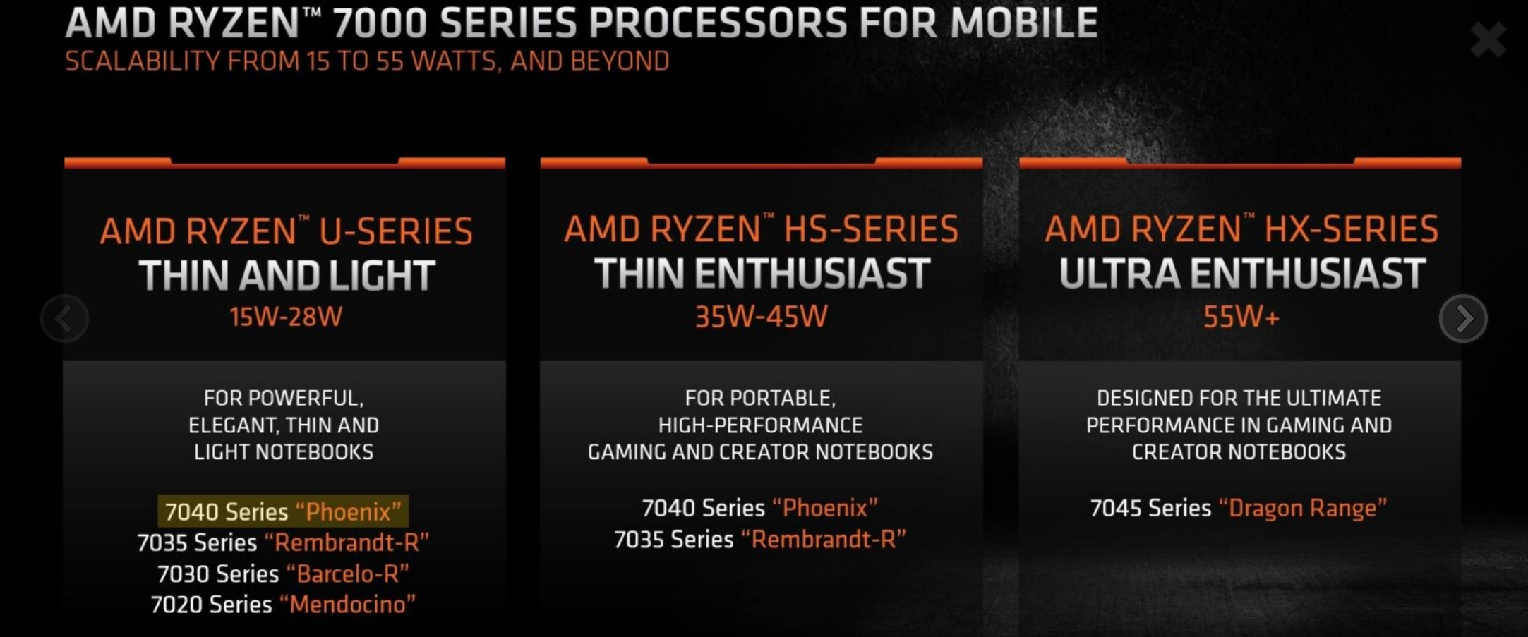 AMD가 실제로 Ryzen 7040 U 시리즈에 얼마나 많은 SKU를 보유하게 될지는 명확하지 않지만 지금까지 3개의 SKU가 온라인으로 유출되었습니다. Ryzen 7040 시리즈를 언급한 이전 슬라이드에서는 TDP가 15W ~ 28W인 얇고 가벼운 세그먼트에 넣었습니다. W - 45W "얇은 매니아" HS 시리즈 세그먼트. 또한 최근에 출시된 7045 시리즈 Dragon Range APU가 포함된 "초매니아" HX 시리즈 세그먼트도 있습니다.