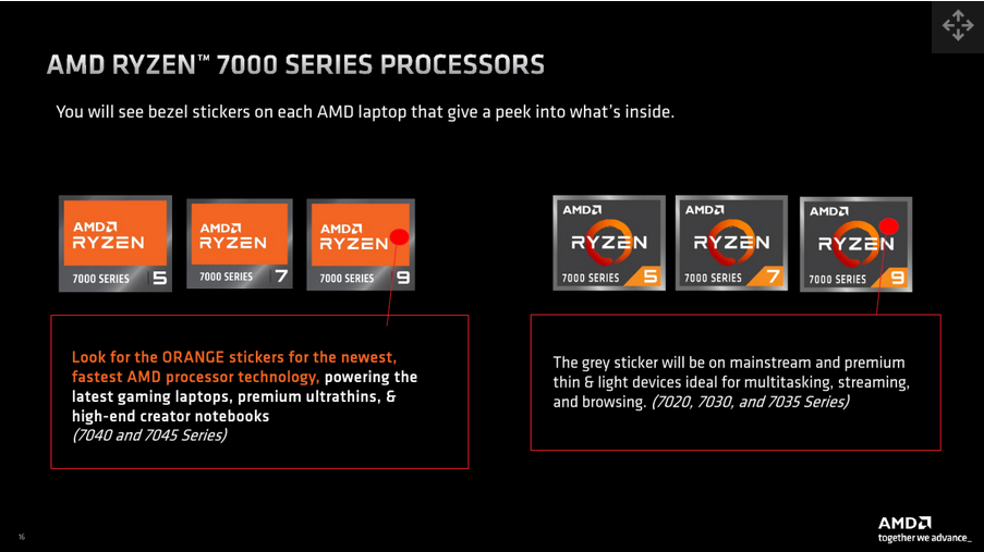 사실 Ryzen 7000 모델 번호의 세 번째 숫자는 마이크로아키텍처를 나타내지만 새 PC를 구매할 때 모델 번호 시스템을 알거나 기억하는 구매자는 거의 없습니다. 그래서 AMD는 파트너들에게 Zen 4 기반 Ryzen 7040/7045 시리즈 'Dragon Range' 및 'Phoenix' APU 기반 시스템에 새로운 주황색 Ryzen 7000 시리즈 스티커를 사용하도록 요청했습니다 . 미드레인지 및 보급형 노트북에는 기존 은색/회색 스티커가 붙습니다. 이는 노트북에 Zen 3 및 RDNA 2 그래픽이 포함된 Zen 3 기반 Ryzen 7030 시리즈 'Rembrandt' CPU 또는 잠재적으로 더 오래된 Zen 2 기반 Ryzen 7020 시리즈 칩이 있음을 나타냅니다. ( 이것을 먼저 알아낸 VideoCardz 에게 경의를 표합니다.)