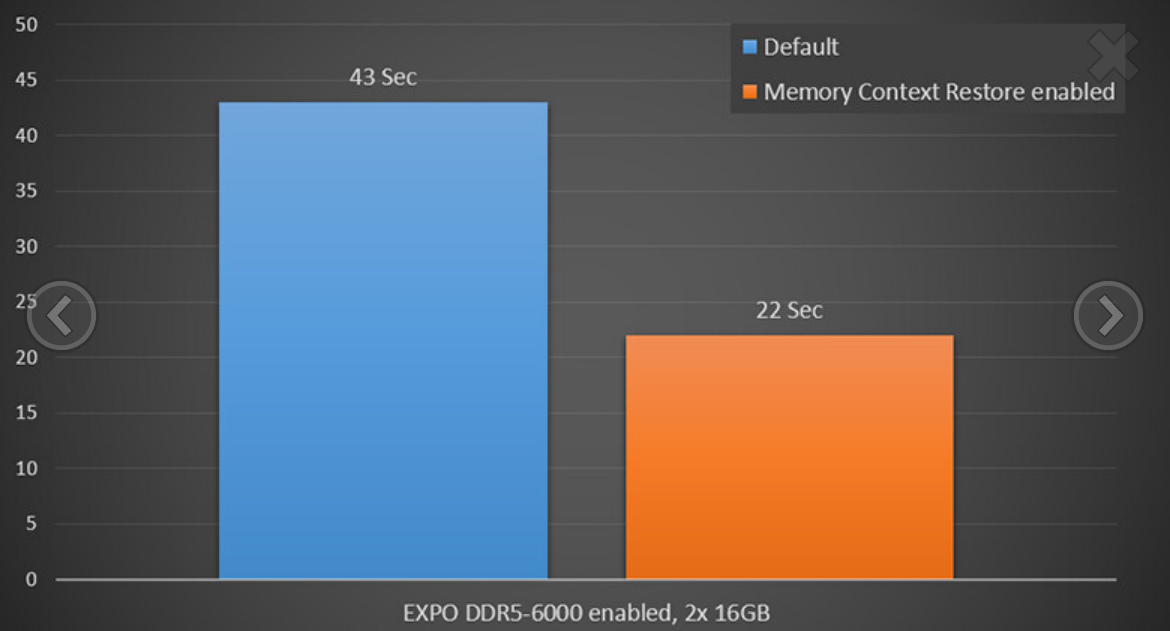 마지막으로 새로운 메모리 컨텍스트 복원은 성능과 관련이 없지만 확실히 AM5 플랫폼의 부팅 시간을 줄여 삶을 더 쉽게 만듭니다. 테스트 결과에 따르면 메모리 컨텍스트 복원을 활성화하면 부팅 시간이 50% 단축됩니다.