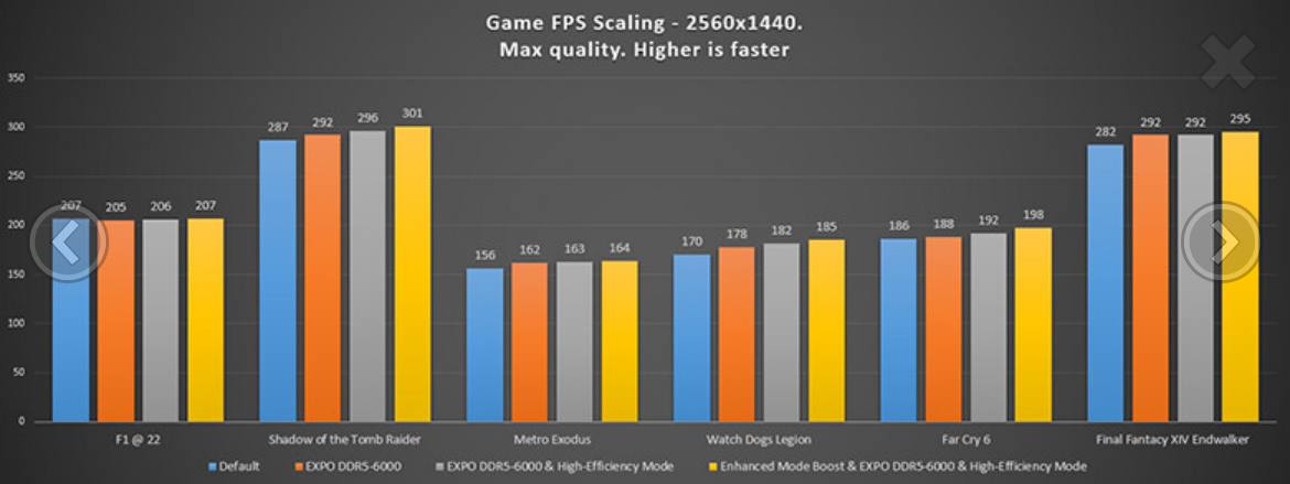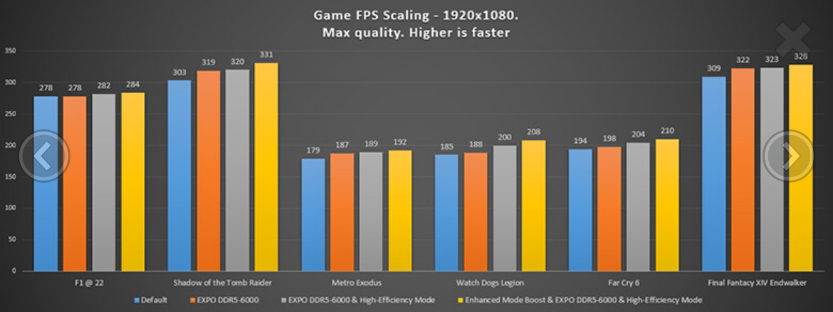 Ryzen 7000X3D 시리즈 프로세서는 코어 클럭 조정을 지원하지 않지만 Enhanced Mode Boost 및 High-Efficiency Mode 활성화로 게임 성능이 최대 12% 향상되었습니다.