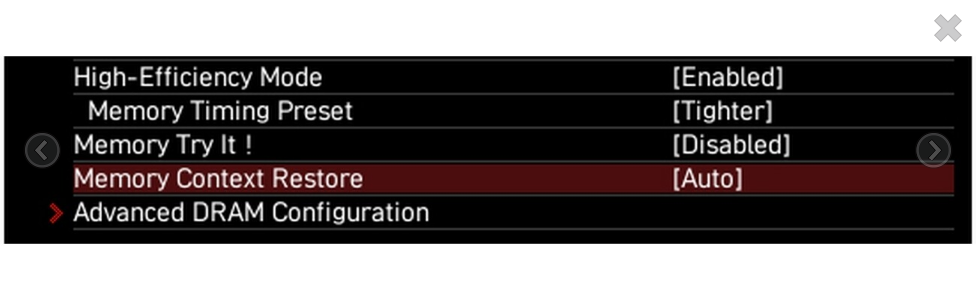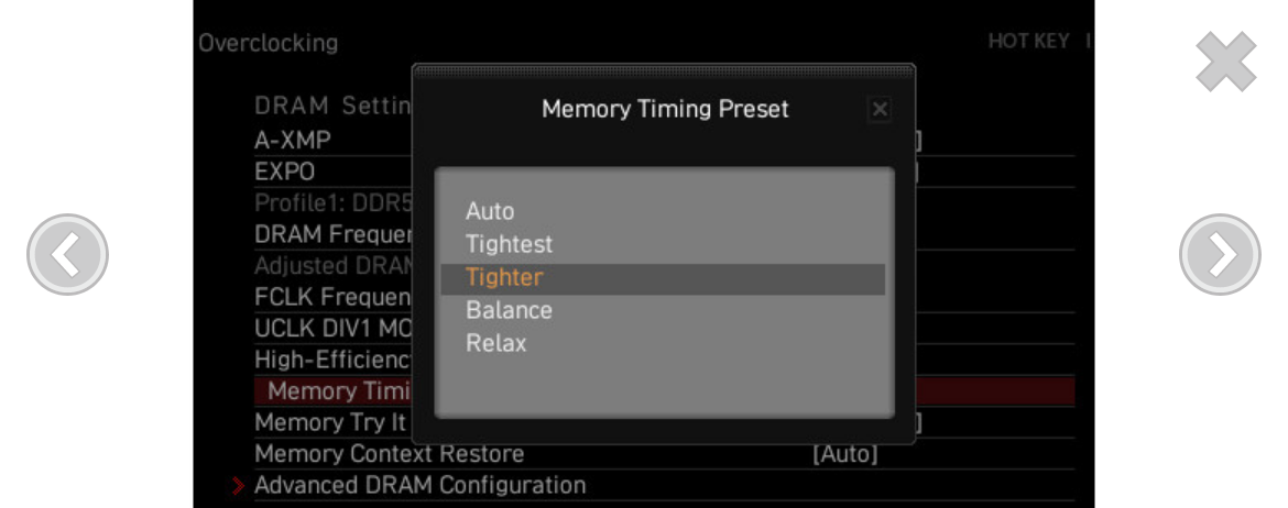 또 다른 독점 기능 - 고효율 모드는 대기 시간을 줄이고 대역폭을 개선하여 최적화된 메모리 타이밍 사전 설정을 제공합니다. 사용자는 사용되는 다양한 메모리 모듈에 대해 4가지 수준의 Tightest, Tighter, Balance 및 Relax로 최상의 성능을 미세 조정할 수 있습니다.