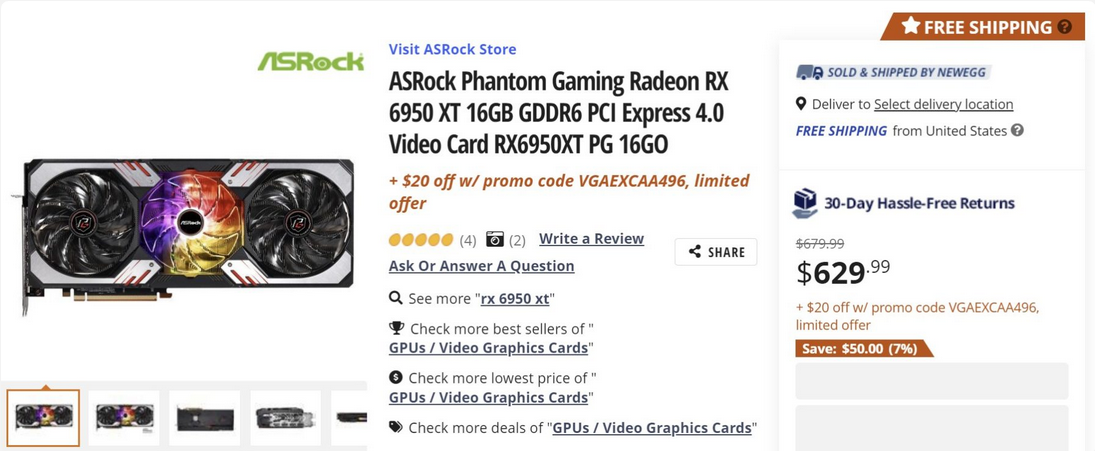 ASRock의 Phantom Gaming Radeon RX 6950XT에는 전체 Navi 21 GPU와 16GB의 GDDR6 메모리가 장착되어 있습니다. 이 카드는 현재 629.99달러에 나와 있지만 가격을 20달러 더 낮추는 추가 프로모션 코드가 있습니다. 이것은 지금까지 RX 6950XT의 최저 가격이며 이제 불과 몇 주 전에 RX 6900 XT 가격에 도달하는 경로에 있습니다.