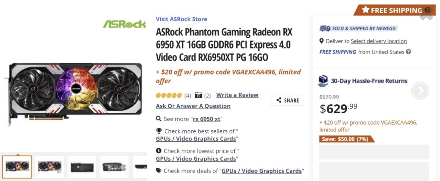 어제 RDNA 2 플래그십이었던 AMD Radeon RX 6950 XT가 Kyle Bennet에 의해 609.99달러까지 할인된 모습이 포착되었는데, 바로 ASRock의 Phantom Gaming Radeon RX 6950XT였습니다. 거래는 여전히 Newegg.com에서 가능하며 여전히 훌륭한 카드인 Radeon RX 6950 XT의 최저 가격입니다. 새로 출시된 NVIDIA GeForce RTX 4070은 여전히 널리 사용 가능하며 MSRP $599.99에서 선택할 수 있는 SKU가 많습니다.