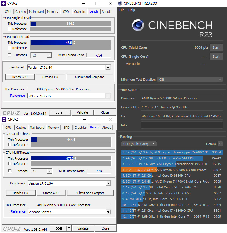 cpuz의 벤치는 2회, cinebench23 멀티1회 실행했다.
