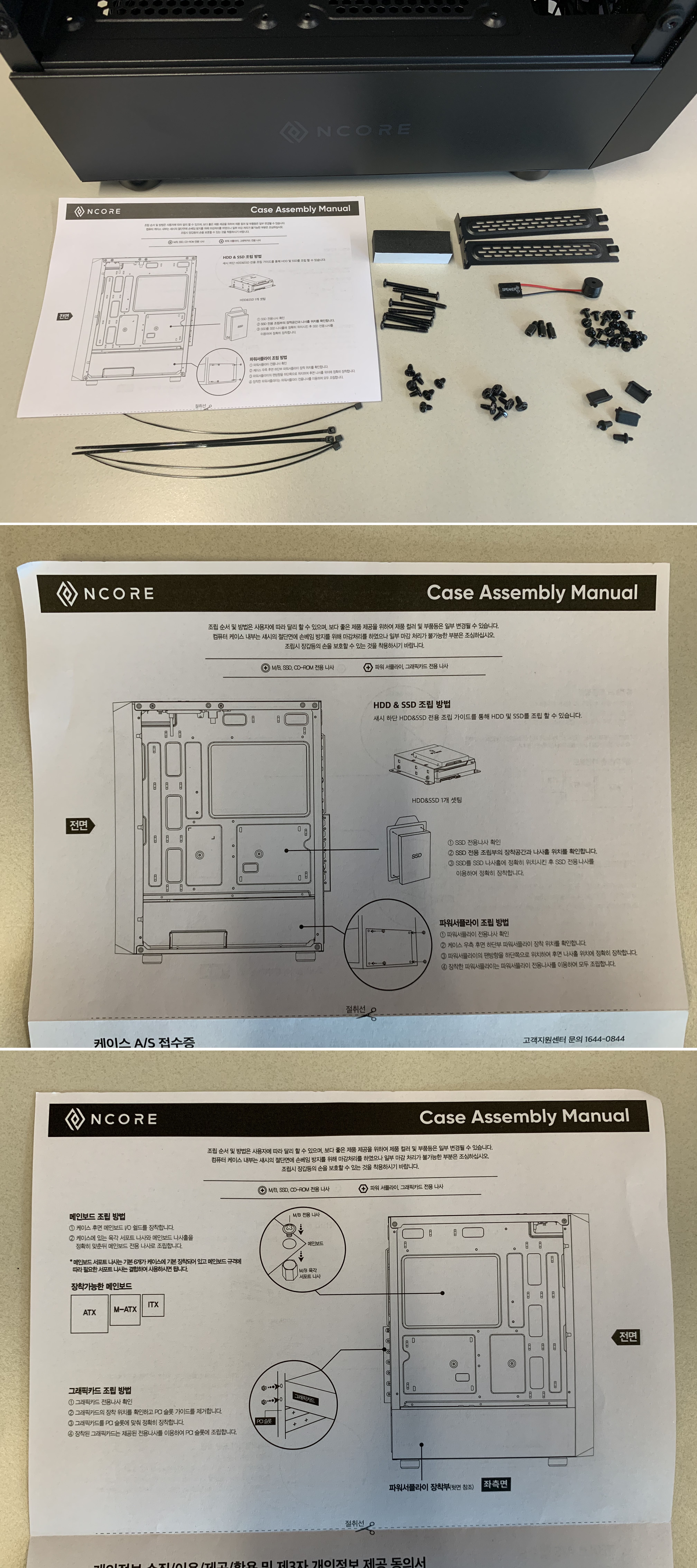 케이스 안에는 구성품으로 설명서와 조립시 필요한 나사등이 포함되어 있습니다.
