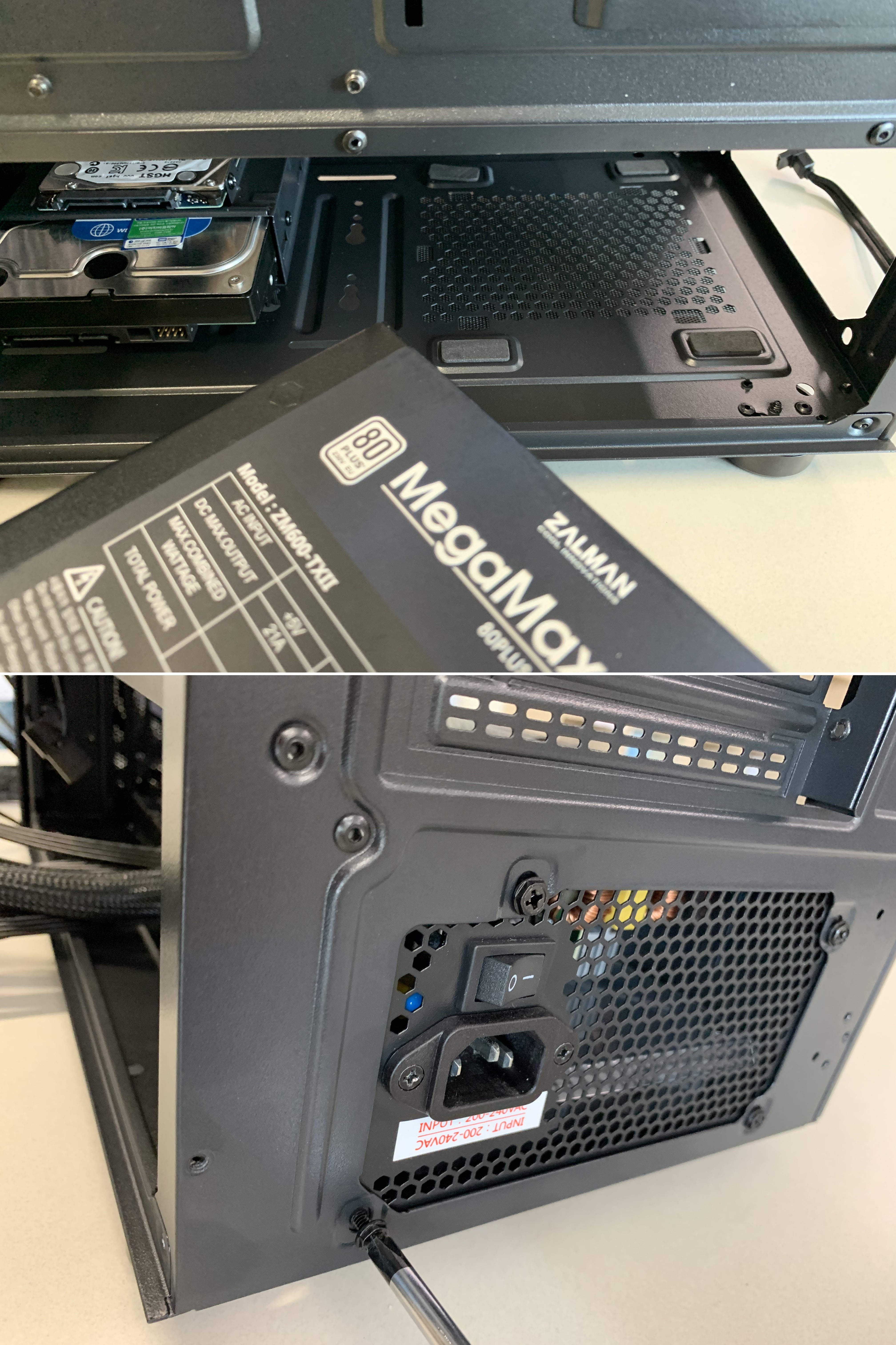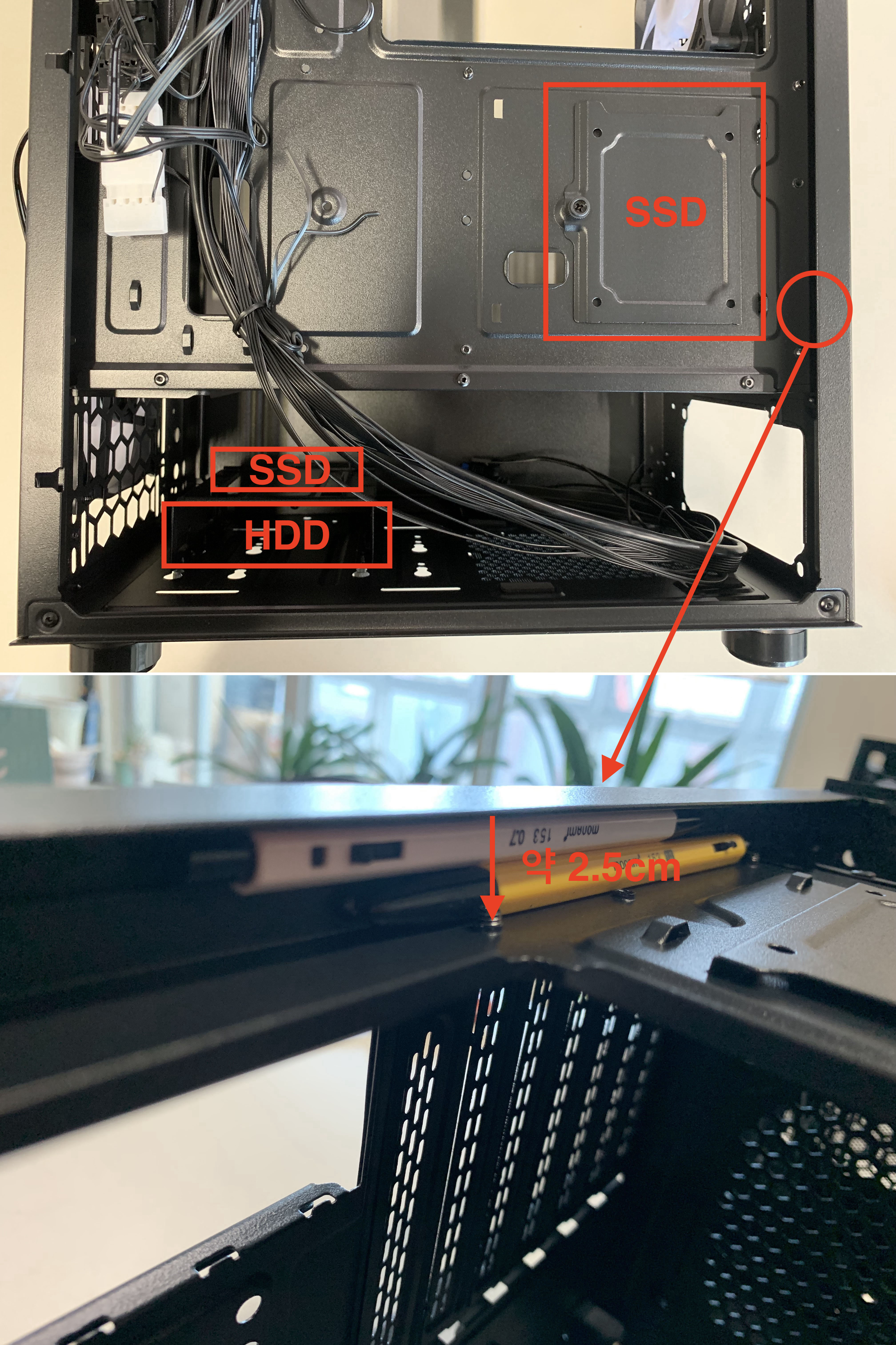 케이스 하단에 HDD와 SSD를 설치했습니다.
