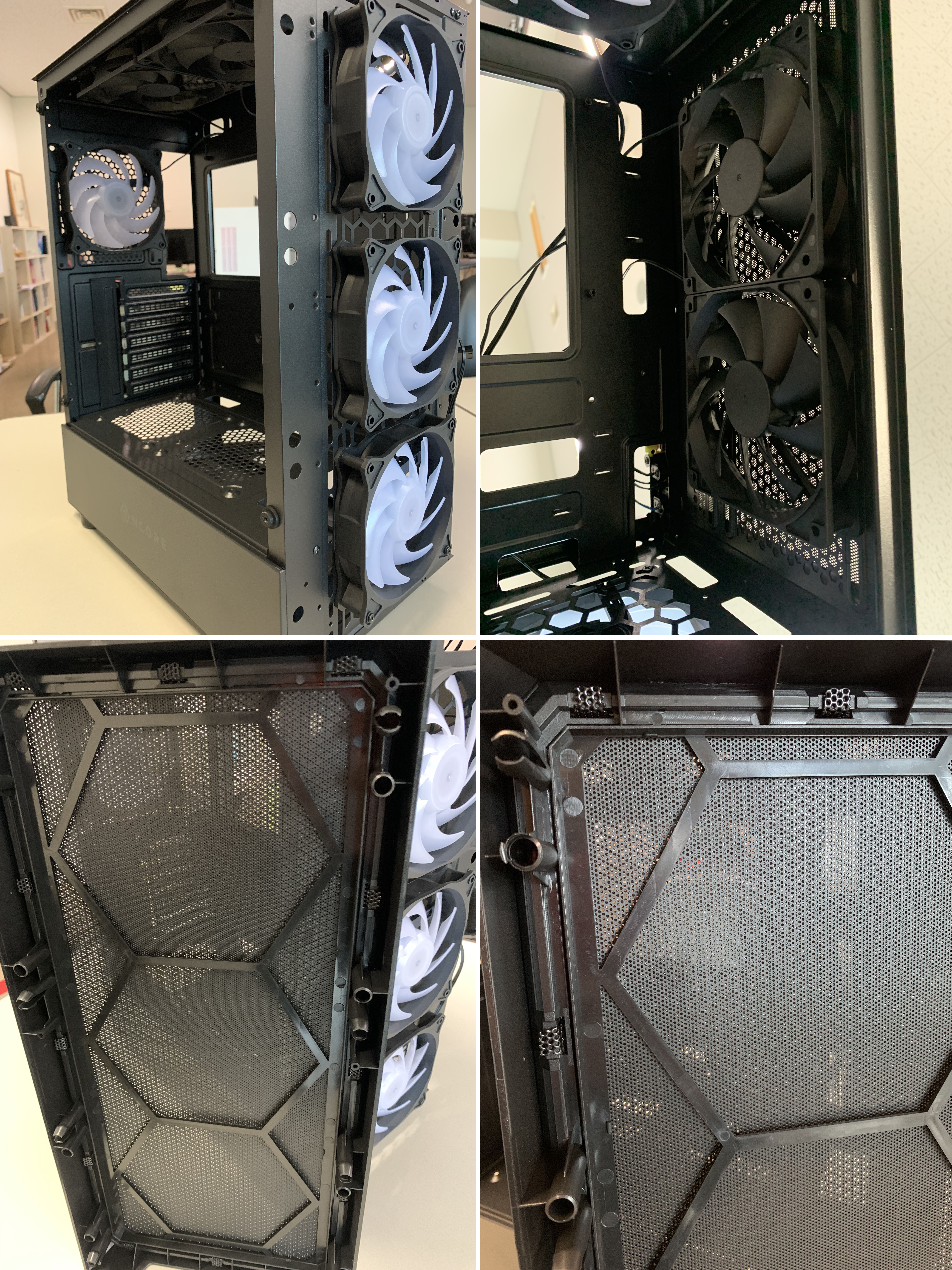 전면 3개, 후면 1개, 상단 2개로 총 6개의 팬으로 구성되어 있습니다.
