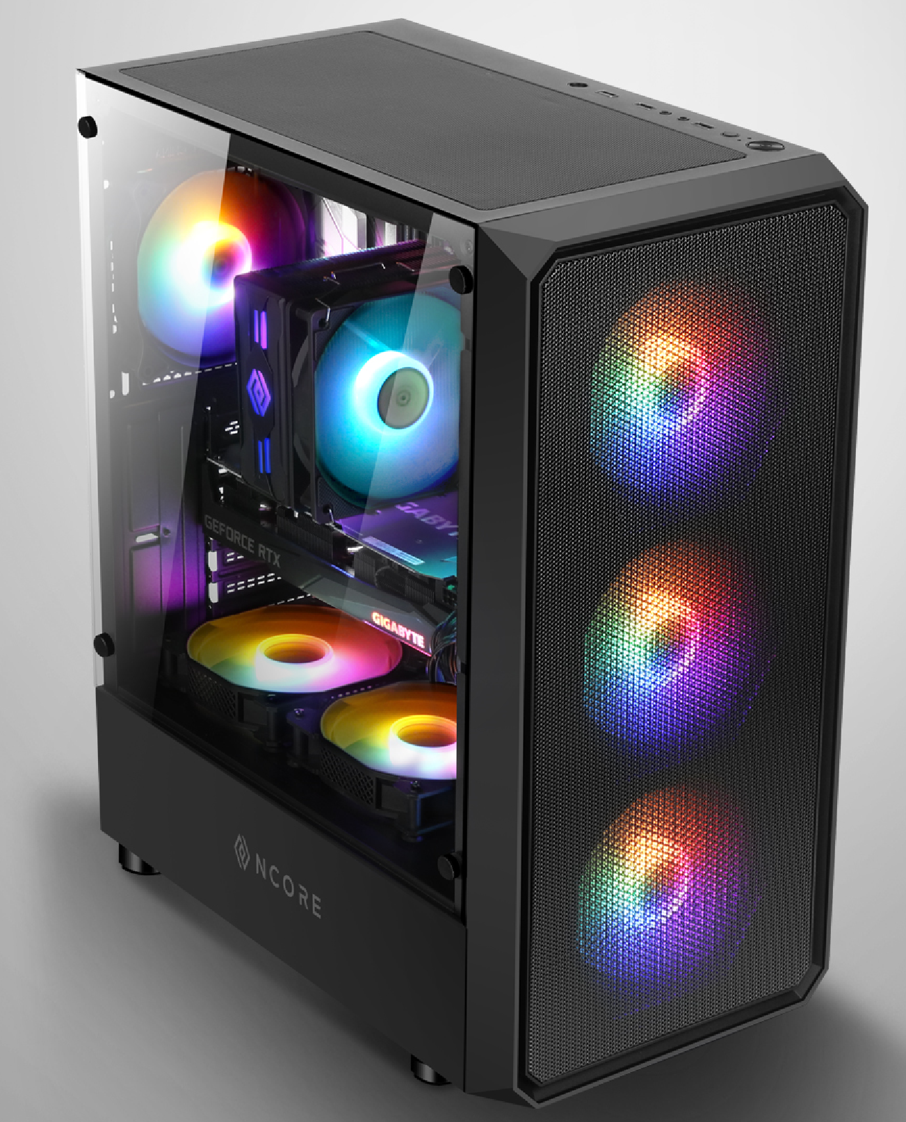 컴퓨터/노트북/조립PC>PC주요부품>케이스, 요약정보 : PC케이스(ATX) / 미들타워 / 파워미포함 / 표준-ATX / Micro-ATX / Mini-ITX / 쿨링팬: 총6개 / LED팬: 4개 / 전면 패널 타입: 메쉬 / 측면: 강화유리 / 후면: