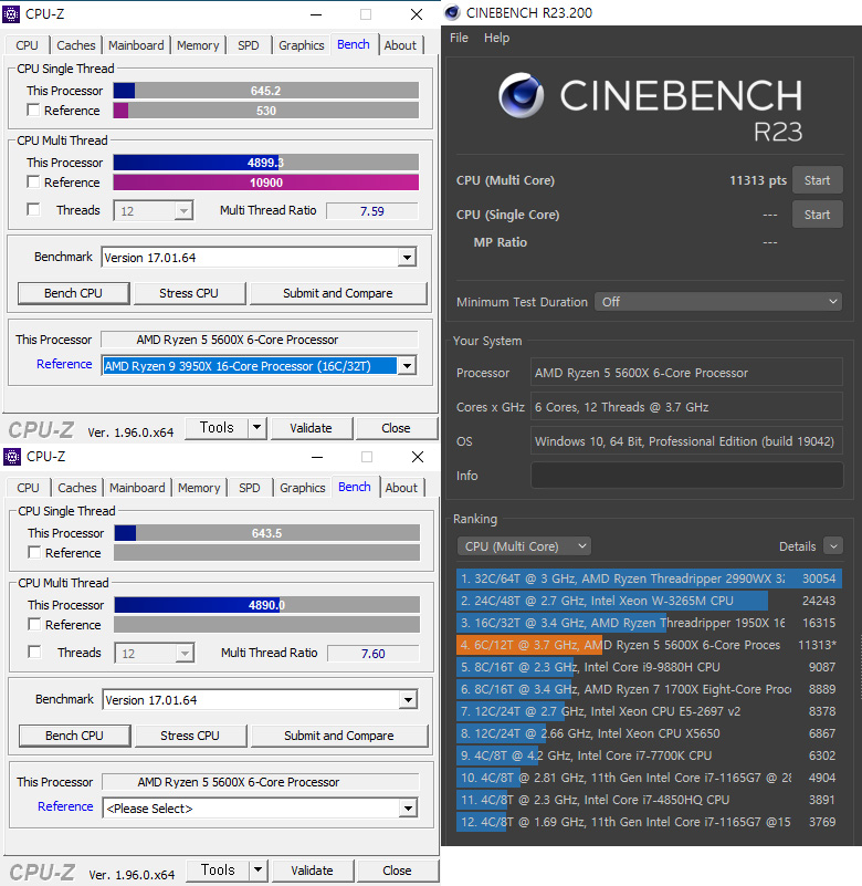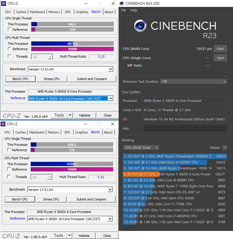 cpuz의 벤치는 2회, cinebench23 멀티1회 실행했다.