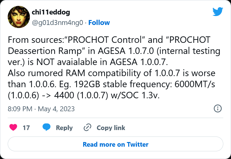 유출자 chi11eddog 에 따르면 현재 AGESA 1.0.0.7 BIOS 펌웨어는 AGESA 1.0.0.6 BIOS의 DDR5-6000 속도에 비해 DDR5-4400 속도만 지원할 수 있습니다. 이는 EXPO가 제한되었으며 더 빠른 메모리 속도를 즐길 수 있는 유일한 방법은 이전 AGESA 펌웨어를 사용하는 것임을 의미합니다.